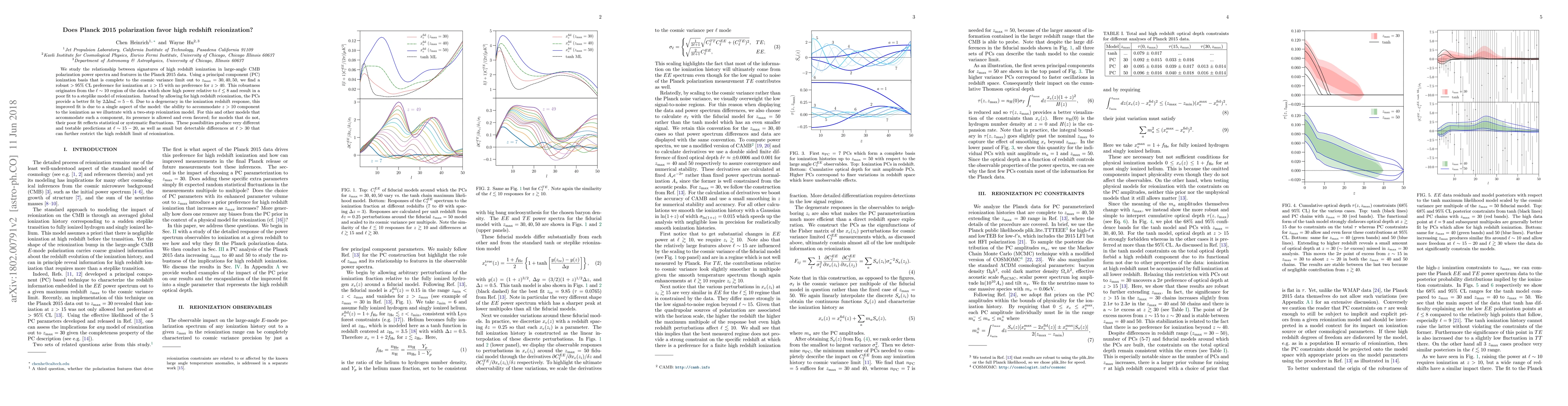 We study the relationship between signatures of high redshift ionization in large-angle CMB polarization power spectra and features in the Planck 2015 data. Using a principal component (PC) ionization basis that is complete to the cosmic variance limit out to $z_{\rm max}=30,40,50$, we find a robust $>95\%$ CL preference for ionization at $z>15$ with no preference for $z>40$. This robustness originates from the $\ell \sim 10$ region of the data which show high power relative to $\ell \le 8$ and result in a poor fit to a steplike model of reionization. Instead by allowing for high redshift reionization, the PCs provide a better fit by $2\Delta \mathrm{ln}\mathcal{L} = 5-6$. Due to a degeneracy in the ionization redshift response, this improved fit is due to a single aspect of the model: the ability to accommodate $z>10$ component to the ionization as we illustrate with a two-step reionization model. For this and other models that accommodate such a component, its presence is allowed and even favored; for models that do not, their poor fit reflects statistical or systematic fluctuations. These possibilities produce very different and testable predictions at $\ell \sim 15-20$, as well as small but detectable differences at $\ell>30$ that can further restrict the high redshift limit of reionization.
