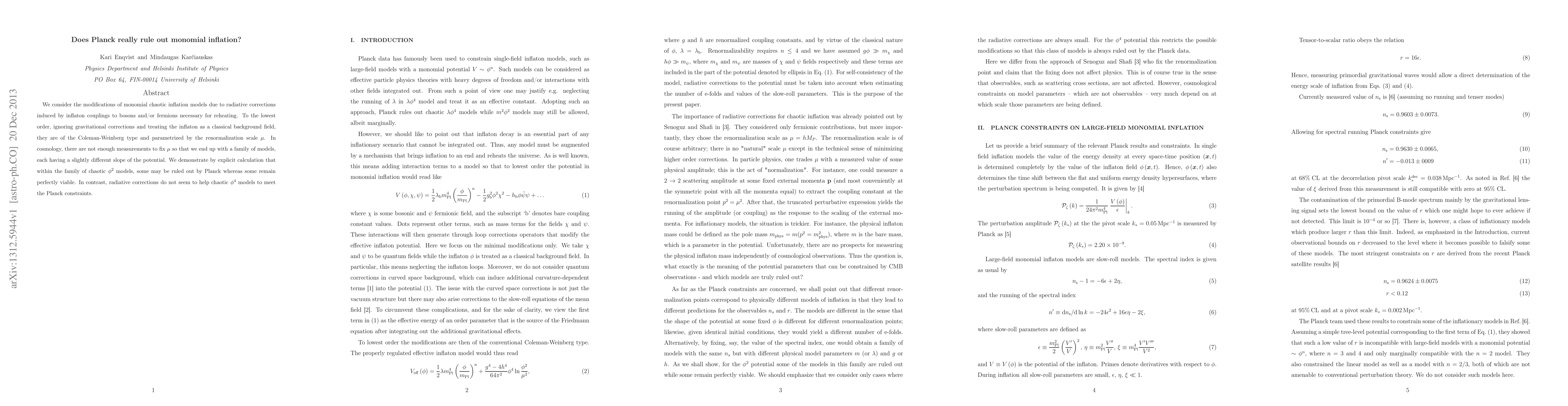 We consider the modifications of monomial chaotic inflation models due to radiative corrections induced by inflaton couplings to bosons and/or fermions necessary for reheating. To the lowest order, ignoring gravitational corrections and treating the inflaton as a classical background field, they are of the Coleman-Weinberg type and parametrized by the renormalization scale $\mu$. In cosmology, there are not enough measurements to fix $\mu$ so that we end up with a family of models, each having a slightly different slope of the potential. We demonstrate by explicit calculation that within the family of chaotic $\phi^2$ models, some may be ruled out by Planck whereas some remain perfectly viable. In contrast, radiative corrections do not seem to help chaotic $\phi^{4}$ models to meet the Planck constraints.