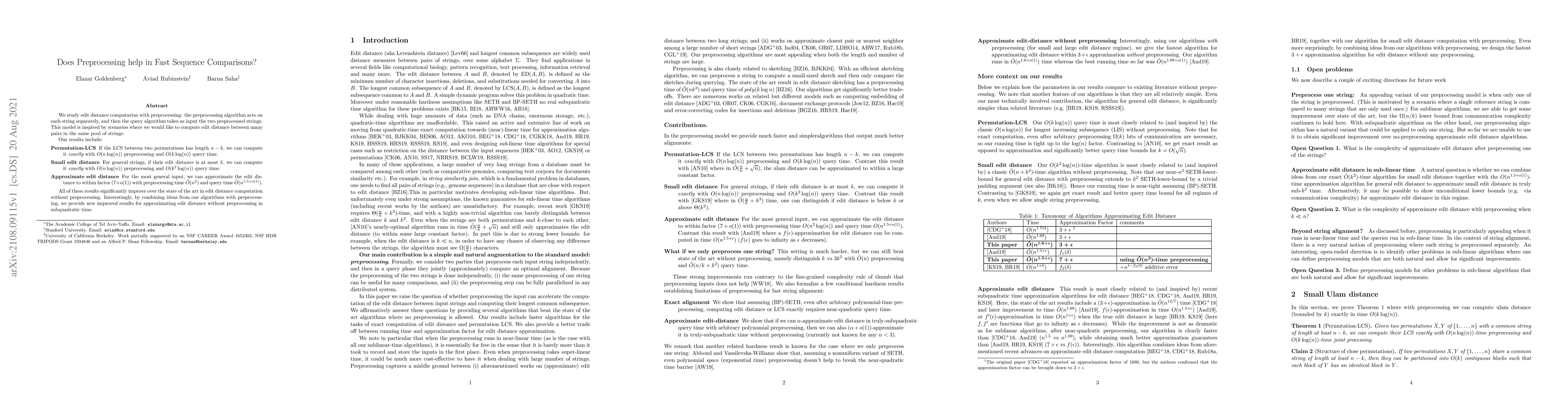 This paper investigates the benefits of preprocessing algorithms for fast sequence comparison, specifically edit distance computation. It presents efficient methods for exact and approximate edit distance calculations, achieving significant improvements over existing techniques, especially when comparing many pairs within the same string pool.