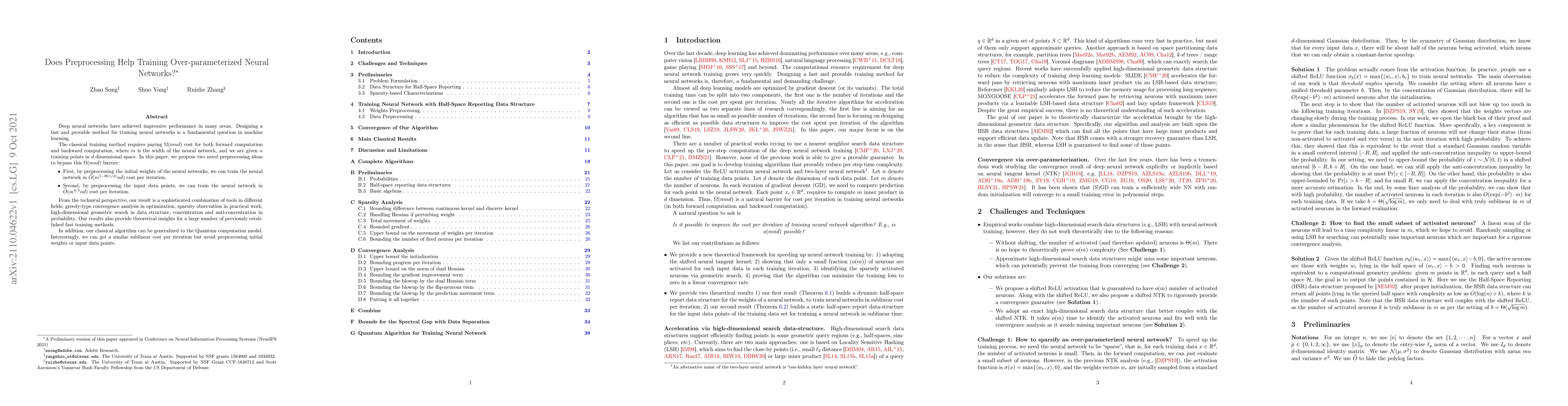 This paper proposes two novel preprocessing techniques to significantly reduce the training cost of over-parameterized neural networks, achieving $\widetilde{O}(m^{1-\Theta(1/d)} n d)$ and $\widetilde{O}(m^{4/5} nd)$ cost per iteration respectively. The study combines various optimization, geometric, and probabilistic tools to provide theoretical insights and generalizes the classical algorithm to the quantum computation model.