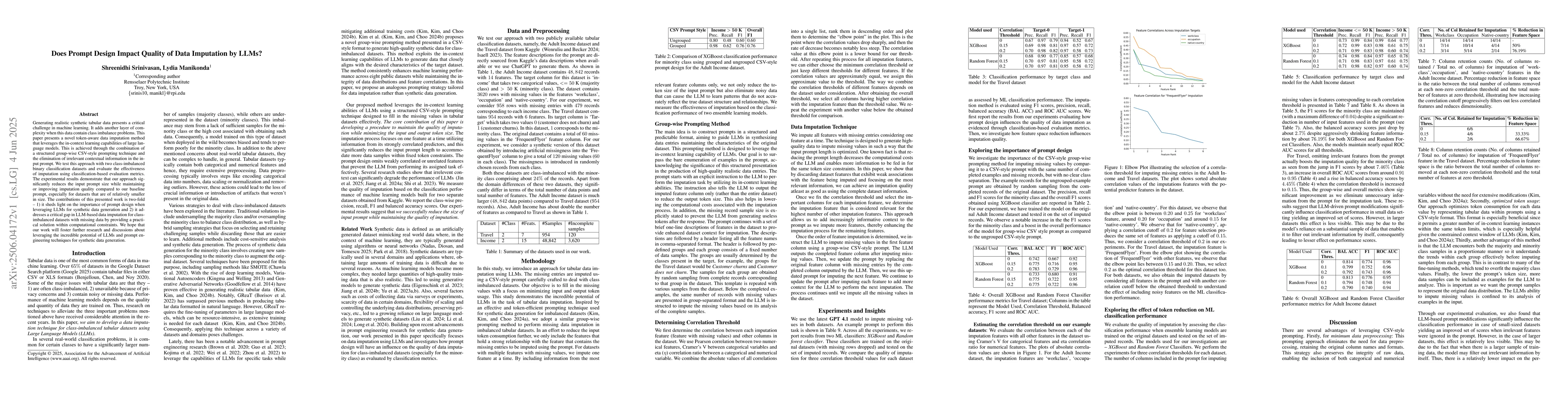 This work highlights the importance of prompt design in leveraging LLMs for synthetic data generation and addresses a gap in LLM-based data imputation for class-imbalanced datasets with missing values, offering a practical solution within computational constraints.