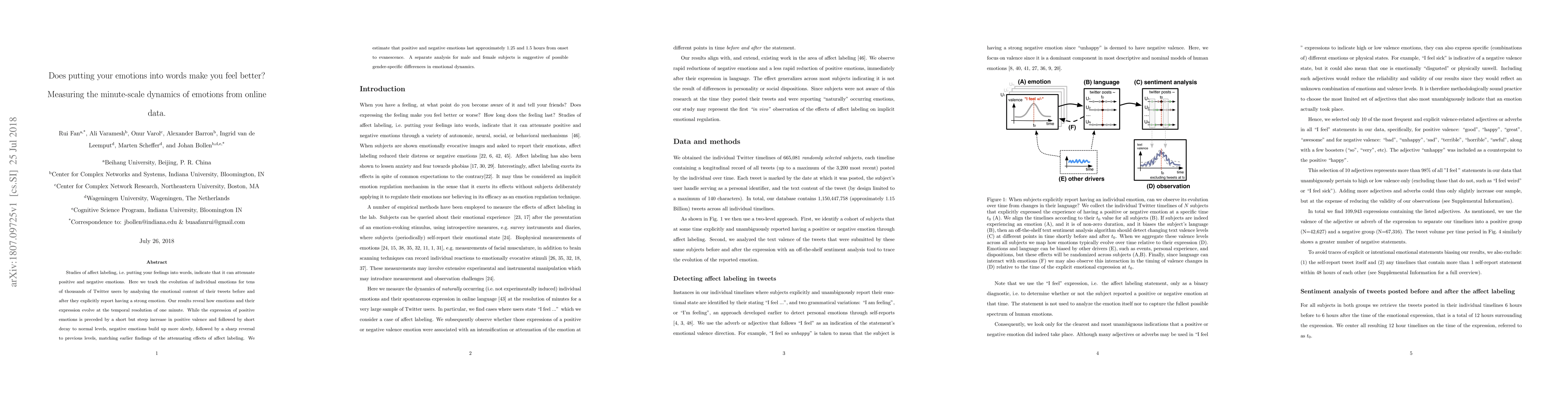 Studies of affect labeling, i.e. putting your feelings into words, indicate that it can attenuate positive and negative emotions. Here we track the evolution of individual emotions for tens of thousands of Twitter users by analyzing the emotional content of their tweets before and after they explicitly report having a strong emotion. Our results reveal how emotions and their expression evolve at the temporal resolution of one minute. While the expression of positive emotions is preceded by a short but steep increase in positive valence and followed by short decay to normal levels, negative emotions build up more slowly, followed by a sharp reversal to previous levels, matching earlier findings of the attenuating effects of affect labeling. We estimate that positive and negative emotions last approximately 1.25 and 1.5 hours from onset to evanescence. A separate analysis for male and female subjects is suggestive of possible gender-specific differences in emotional dynamics.