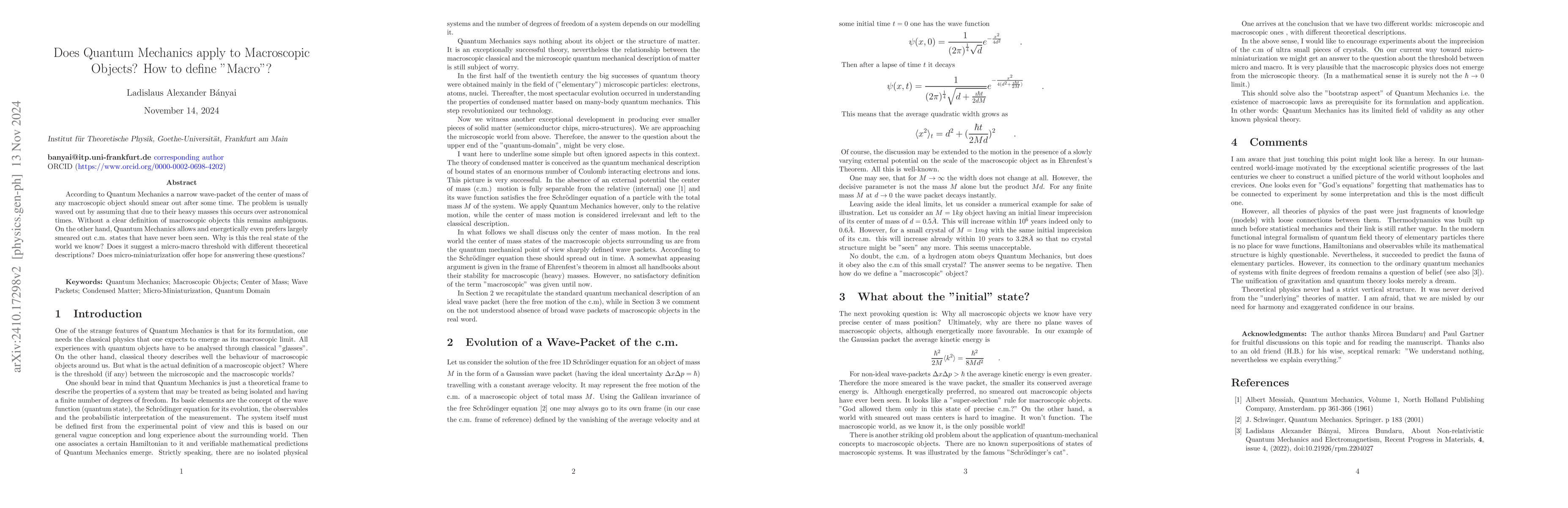 The paper discusses the theoretical framework of quantum mechanics applied to macroscopic objects, focusing on the center of mass wave-packet evolution and its implications.