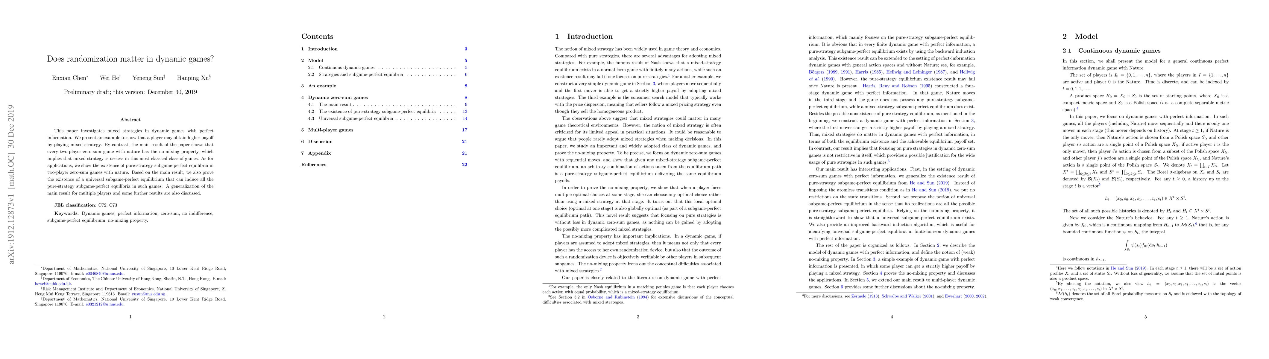 This paper investigates mixed strategies in dynamic games with perfect information. We present an example to show that a player may obtain higher payoff by playing mixed strategy. By contrast, the main result of the paper shows that every two-player dynamic zero-sum game with nature has the no-mixing property, which implies that mixed strategy is useless in this most classical class of games. As for applications, we show the existence of pure-strategy subgame-perfect equilibria in two-player zero-sum games with nature. Based on the main result, we also prove the existence of a universal subgame-perfect equilibrium that can induce all the pure-strategy subgame-perfect equilibria in such games. A generalization of the main result for multiple players and some further results are also discussed.