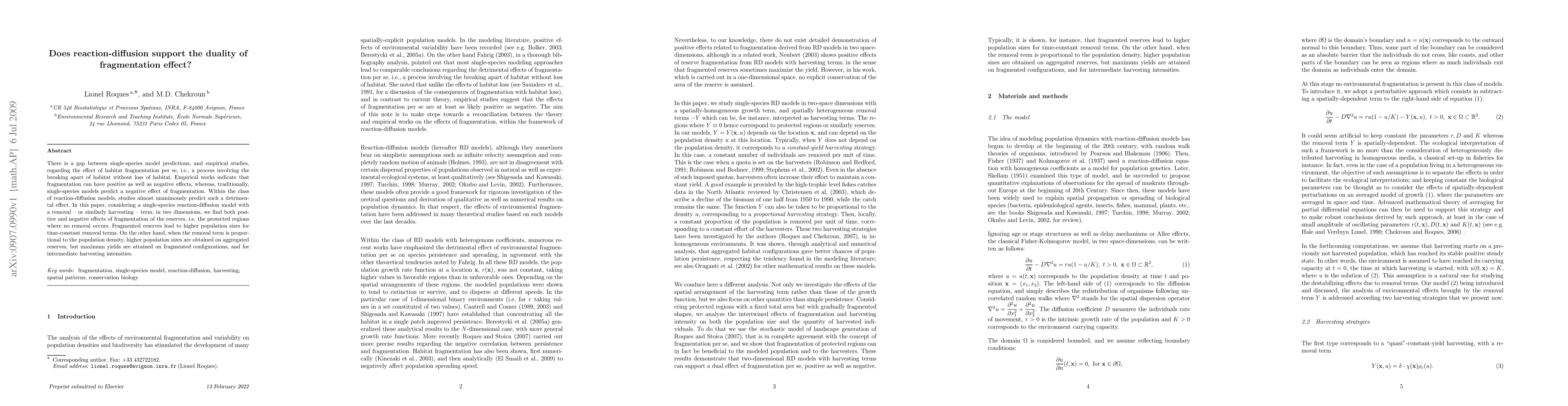 A reaction-diffusion model found that habitat fragmentation can have both positive and negative effects on population sizes, depending on the type of removal term used in the model. Fragmentation leads to higher population sizes for certain removal terms, while aggregated reserves yield more maximum yields.