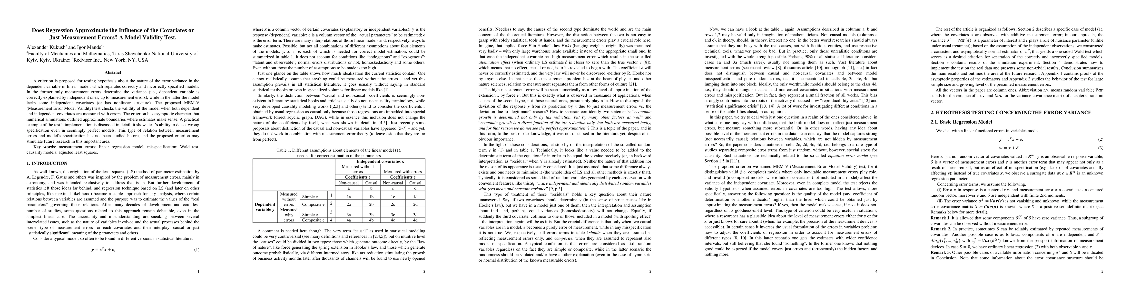 A criterion is proposed for testing hypothesis about the nature of the error variance in the dependent variable in linear model, which separates correctly and incorrectly specified models. In the former only measurement errors determine the variance (i.e., dependent variable is correctly explained by independent ones, up to measurement errors), while in the latter the model lacks some independent covariates (or has nonlinear structure). The proposed MEM-V (Measurement Error Model Validity) test checks the validity of the model when both dependent and independent covariates are measured with errors. The criterion has asymptotic character, but numerical simulations outlined approximate boundaries where estimates make sense. A practical example of the implementation of the test is discussed in detail; it shows ability of the test to detect wrong specification even in seemingly perfect models. This type of relation between measurement errors and model specification has not been studied before, and the proposed criterion may stimulate future research in this important area.