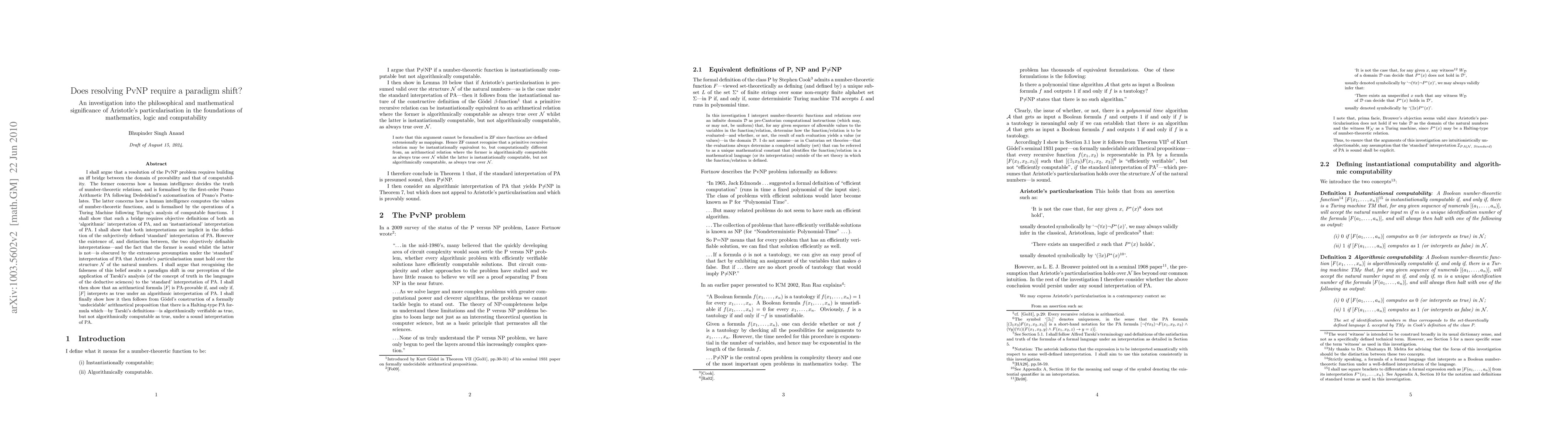 I shall argue that a resolution of the PvNP problem requires building an iff bridge between the domain of provability and that of computability. The former concerns how a human intelligence decides the truth of number-theoretic relations, and is formalised by the first-order Peano Arithmetic PA following Dededekind's axiomatisation of Peano's Postulates. The latter concerns how a human intelligence computes the values of number-theoretic functions, and is formalised by the operations of a Turing Machine following Turing's analysis of computable functions. I shall show that such a bridge requires objective definitions of both an `algorithmic' interpretation of PA, and an `instantiational' interpretation of PA. I shall show that both interpretations are implicit in the definition of the subjectively defined `standard' interpretation of PA. However the existence of, and distinction between, the two objectively definable interpretations---and the fact that the former is sound whilst the latter is not---is obscured by the extraneous presumption under the `standard' interpretation of PA that Aristotle's particularisation must hold over the structure N of the natural numbers. I shall argue that recognising the falseness of this belief awaits a paradigm shift in our perception of the application of Tarski's analysis (of the concept of truth in the languages of the deductive sciences) to the `standard' interpretation of PA. I shall then show that an arithmetical formula [F] is PA-provable if, and only if, [F] interprets as true under an algorithmic interpretation of PA. I shall finally show how it then follows from Goedel's construction of a formally `undecidable' arithmetical proposition that there is a Halting-type PA formula which---by Tarski's definitions---is algorithmically verifiable as true, but not algorithmically computable as true, under a sound interpretation of PA.