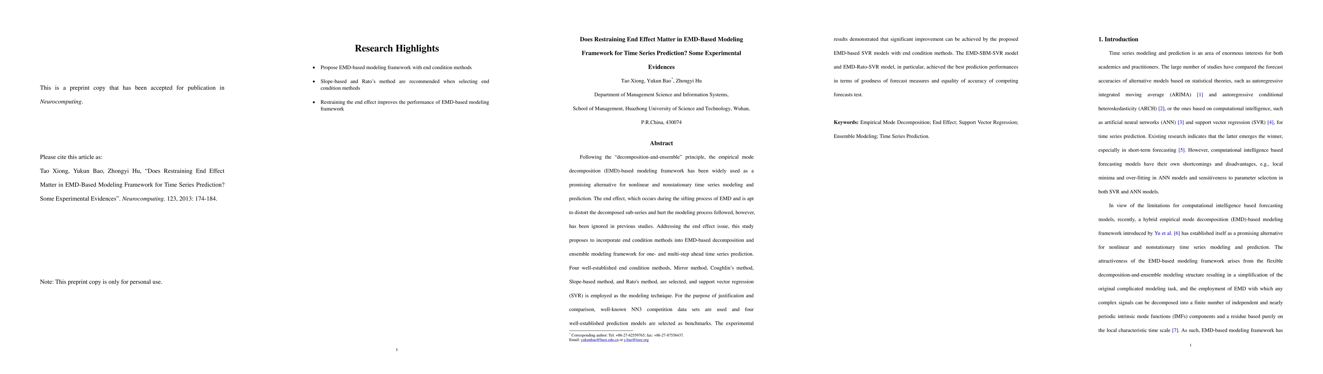 This study investigates the impact of restraining end effects in the EMD-based modeling framework for time series prediction, proposing the incorporation of end condition methods to improve prediction accuracy. Experimental results show that the EMD-SBM-SVR and EMD-Rato-SVR models significantly outperform traditional benchmarks.