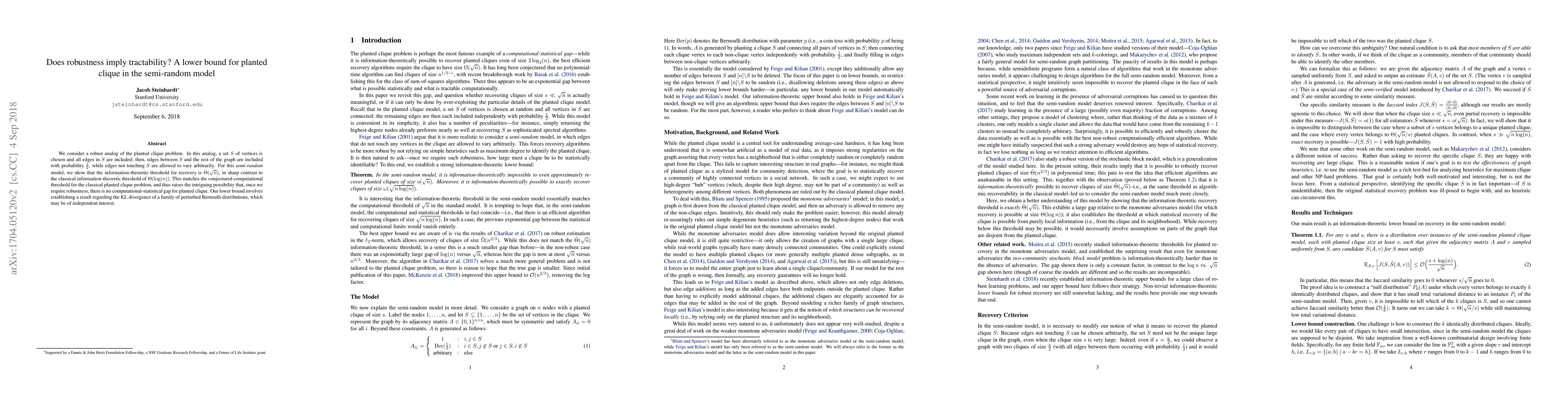 This paper investigates a robust version of the planted clique problem in the semi-random model, demonstrating that the information-theoretic threshold for recovery is $\tilde{\Theta}(\sqrt{n})$, contrasting with the classical $\Theta(\log(n))$ threshold. This suggests a potential computational-statistical gap closure for robust planted clique.