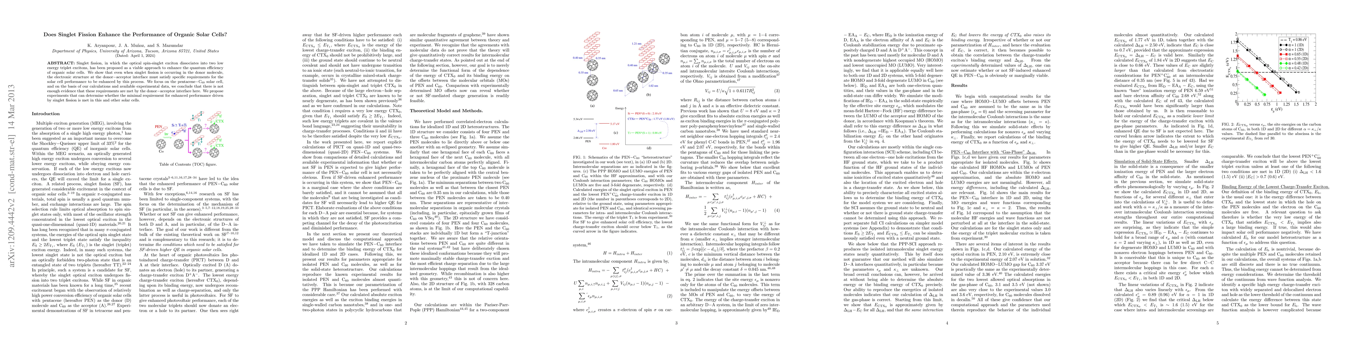 Singlet fission, in which the optical spin-singlet exciton dissociates into two low energy triplet excitons, has been proposed as a viable approach to enhance the quantum efficiency of organic solar cells. We show that even when singlet fission is occurring in the donor molecule, the electronic structure at the donor$-$acceptor interface must satisfy specific requirements for the solar cell performance to be enhanced by this process. We focus on the pentacene$-$C$_{60}$ solar cell, and on the basis of our calculations and available experimental data, we conclude that there is not enough evidence that these requirements are met by the donor$-$acceptor interface here. We propose experiments that can determine whether the minimal requirement for enhanced performance driven by singlet fission is met in this and other solar cells.