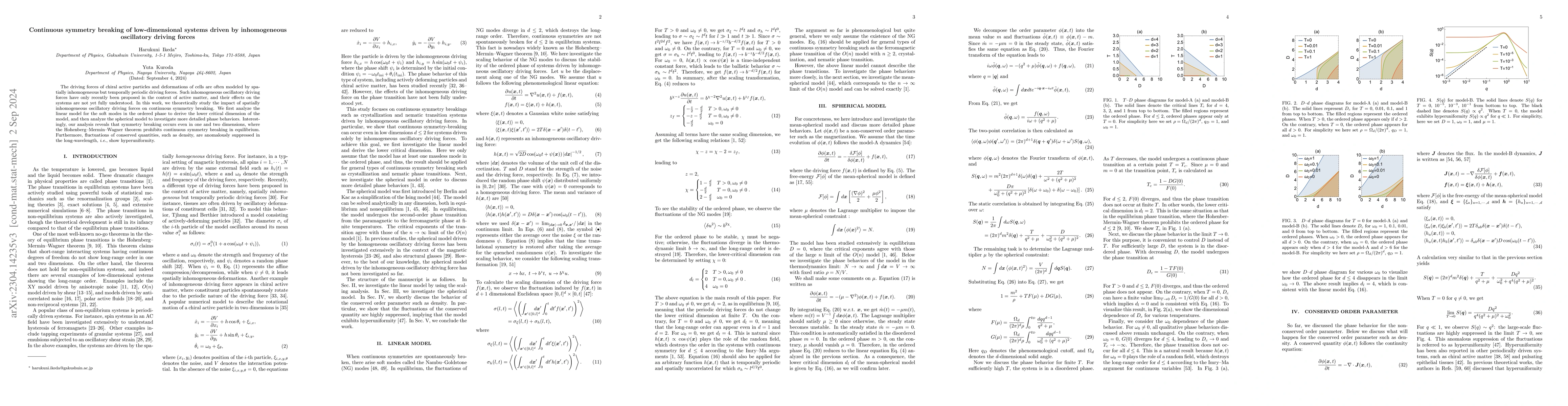 This paper explores whether spontaneous symmetry breaking can occur in periodically driven low-dimensional non-equilibrium systems, demonstrating that the mean-spherical model driven by periodic forces undergoes a ferromagnetic phase transition regardless of the spatial dimension. The conserved order parameter model (model B) also shows hyperuniformity, indicating a potential for symmetry breaking in such systems.