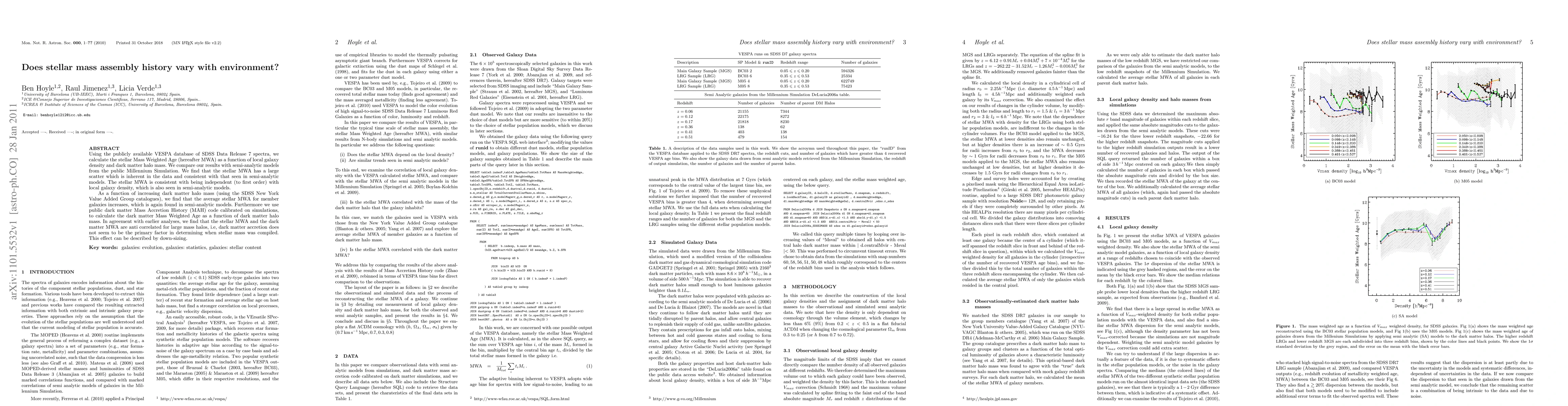 Using the publicly available VESPA database of SDSS Data Release 7 spectra, we calculate the stellar Mass Weighted Age (hereafter MWA) as a function of local galaxy density and dark matter halo mass. We compare our results with semi-analytic models from the public Millennium Simulation. We find that the stellar MWA has a large scatter which is inherent in the data and consistent with that seen in semi-analytic models. The stellar MWA is consistent with being independent (to first order) with local galaxy density, which is also seen in semi-analytic models. As a function of increasing dark matter halo mass (using the SDSS New York Value Added Group catalogues), we find that the average stellar MWA for member galaxies increases, which is again found in semi-analytic models. Furthermore we use public dark matter Mass Accretion History (MAH) code calibrated on simulations, to calculate the dark matter Mass Weighted Age as a function of dark matter halo mass. In agreement with earlier analyses, we find that the stellar MWA and the dark matter MWA are anti correlated for large mass halos, i.e, dark matter accretion does not seem to be the primary factor in determining when stellar mass was compiled. This effect can be described by down-sizing.