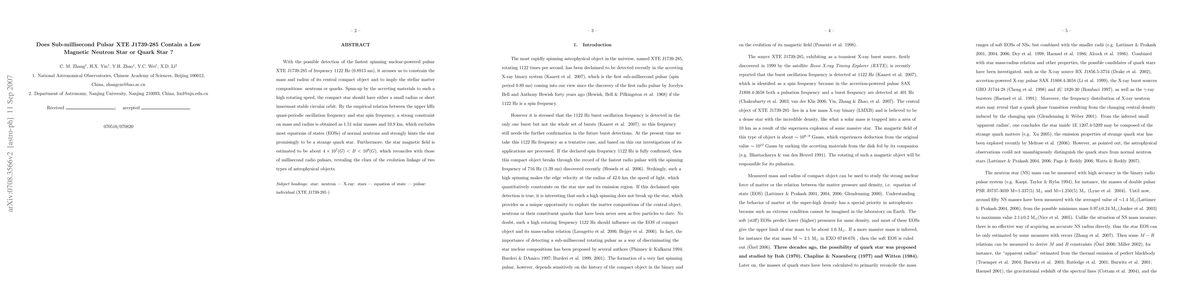 With the possible detection of the fastest spinning nuclear-powered pulsar XTE J1739-285 of frequency 1122 Hz (0.8913 ms), it arouses us to constrain the mass and radius of its central compact object and to imply the stellar matter compositions: neutrons or quarks. Spun-up by the accreting materials to such a high rotating speed, the compact star should have either a small radius or short innermost stable circular orbit. By the empirical relation between the upper kHz quasi-periodic oscillation frequency and star spin frequency, a strong constraint on mass and radius is obtained as 1.51 solar masses and 10.9 km, which excludes most equations of states (EOSs) of normal neutrons and strongly hints the star promisingly to be a strange quark star. Furthermore, the star magnetic field is estimated to be about $4\times10^{7} (G) < B < 10^{9} (G) $, which reconciles with those of millisecond radio pulsars, revealing the clues of the evolution linkage of two types of astrophysical objects.