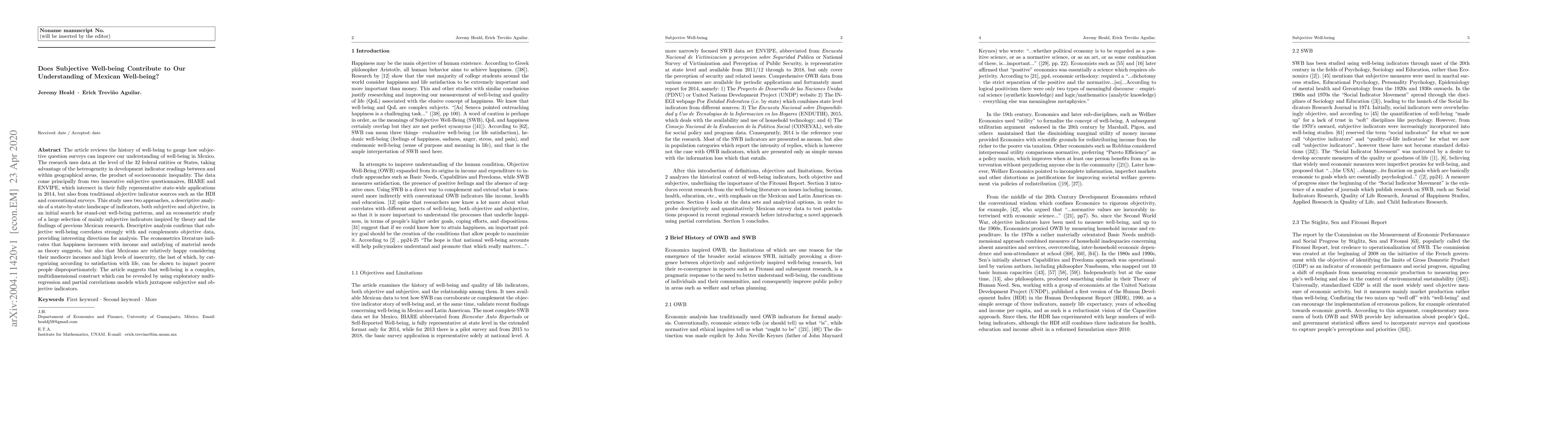 The article reviews the history of well-being to gauge how subjective question surveys can improve our understanding of well-being in Mexico. The research uses data at the level of the 32 federal entities or States, taking advantage of the heterogeneity in development indicator readings between and within geographical areas, the product of socioeconomic inequality. The data come principally from two innovative subjective questionnaires, BIARE and ENVIPE, which intersect in their fully representative state-wide applications in 2014, but also from conventional objective indicator sources such as the HDI and conventional surveys. This study uses two approaches, a descriptive analysis of a state-by-state landscape of indicators, both subjective and objective, in an initial search for stand-out well-being patterns, and an econometric study of a large selection of mainly subjective indicators inspired by theory and the findings of previous Mexican research. Descriptive analysis confirms that subjective well-being correlates strongly with and complements objective data, providing interesting directions for analysis. The econometrics literature indicates that happiness increases with income and satisfying of material needs as theory suggests, but also that Mexicans are relatively happy considering their mediocre incomes and high levels of insecurity, the last of which, by categorizing according to satisfaction with life, can be shown to impact poorer people disproportionately. The article suggests that well-being is a complex, multidimensional construct which can be revealed by using exploratory multi-regression and partial correlations models which juxtapose subjective and objective indicators.