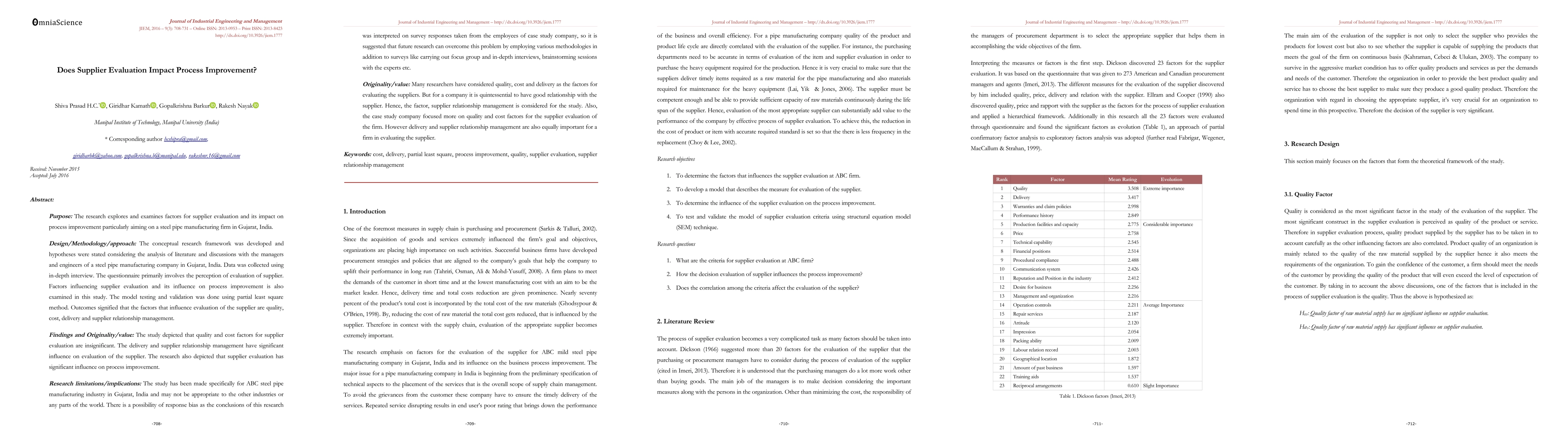 A study in India found that supplier evaluation factors in a steel pipe manufacturing firm were delivery and supplier relationship management, with quality and cost being insignificant, and had a significant impact on process improvement.