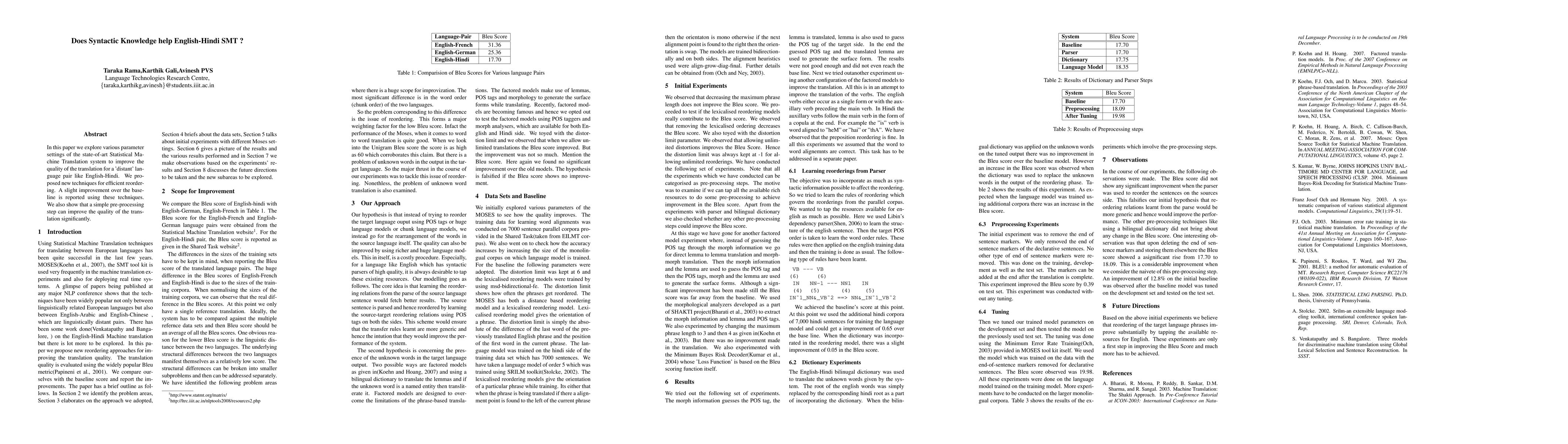 This paper investigates parameter settings and new techniques for improving the translation quality of a Statistical Machine Translation system for the distant language pair English-Hindi, reporting slight improvements over baselines. A simple pre-processing step is shown to significantly enhance translation quality.