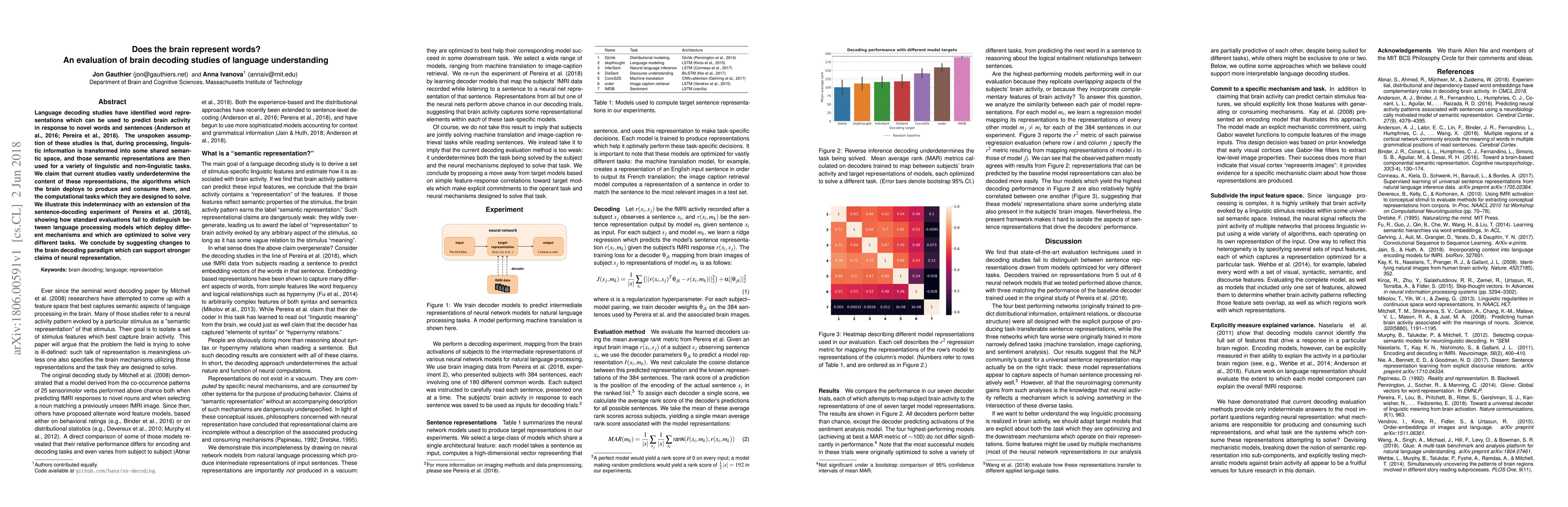 Language decoding studies have identified word representations which can be used to predict brain activity in response to novel words and sentences (Anderson et al., 2016; Pereira et al., 2018). The unspoken assumption of these studies is that, during processing, linguistic information is transformed into some shared semantic space, and those semantic representations are then used for a variety of linguistic and non-linguistic tasks. We claim that current studies vastly underdetermine the content of these representations, the algorithms which the brain deploys to produce and consume them, and the computational tasks which they are designed to solve. We illustrate this indeterminacy with an extension of the sentence-decoding experiment of Pereira et al. (2018), showing how standard evaluations fail to distinguish between language processing models which deploy different mechanisms and which are optimized to solve very different tasks. We conclude by suggesting changes to the brain decoding paradigm which can support stronger claims of neural representation.