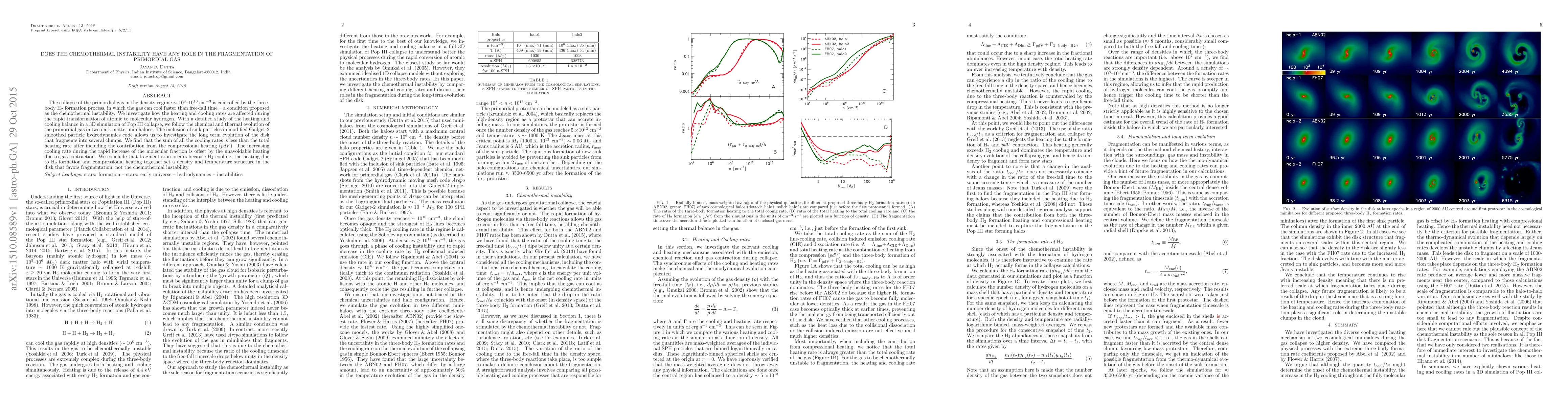 The collapse of the primordial gas in the density regime $\sim 10^{8}\hbox{--}10^{10}$ cm$^{-3}$ is controlled by the three-body $\rm H_2$ formation process, in which the gas can cool faster than free-fall time $\hbox{--}$ a condition proposed as the chemothermal instability. We investigate how the heating and cooling rates are affected during the rapid transformation of atomic to molecular hydrogen. With a detailed study of the heating and cooling balance in a 3D simulation of Pop~III collapse, we follow the chemical and thermal evolution of the primordial gas in two dark matter minihaloes. The inclusion of sink particles in modified Gadget-2 smoothed particle hydrodynamics code allows us to investigate the long term evolution of the disk that fragments into several clumps. We find that the sum of all the cooling rates is less than the total heating rate after including the contribution from the compressional heating ($pdV$). The increasing cooling rate during the rapid increase of the molecular fraction is offset by the unavoidable heating due to gas contraction. We conclude that fragmentation occurs because $\rm H_2$ cooling, the heating due to $\rm H_2$ formation and compressional heating together set a density and temperature structure in the disk that favors fragmentation, not the chemothermal instability.