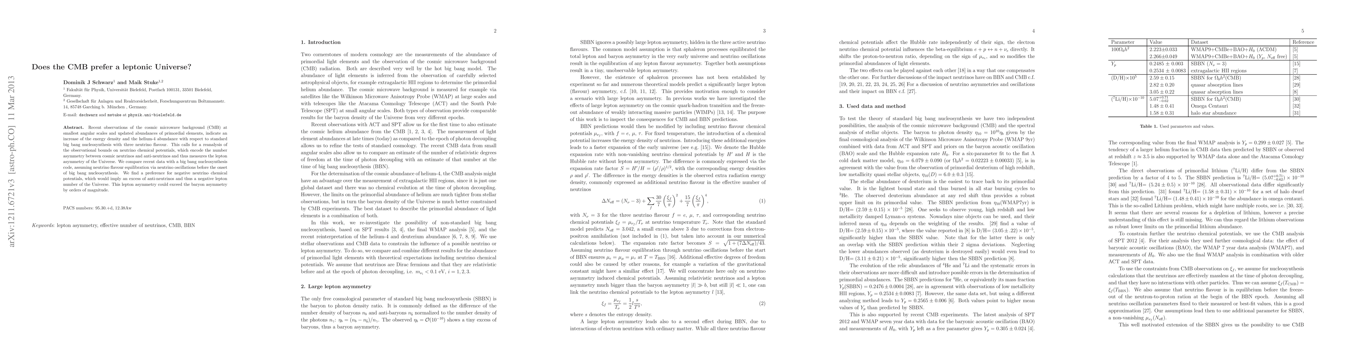 The CMB shows a slight preference for negative neutrino chemical potentials, indicating an excess of anti-neutrinos and a negative lepton number in the Universe. This could imply a lepton asymmetry that exceeds baryon asymmetry by orders of magnitude.