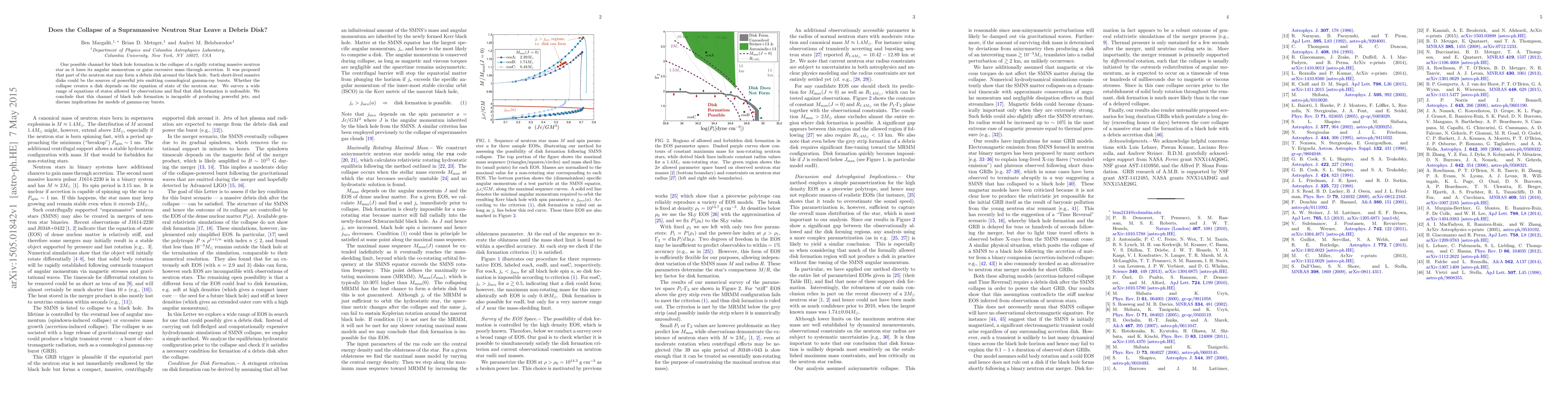 This paper investigates the possibility of debris disks forming around black holes from the collapse of supramassive neutron stars, concluding that such disks are unlikely to form due to the neutron star's equation of state. The findings suggest that this collapse mechanism cannot produce powerful jets associated with gamma-ray bursts.