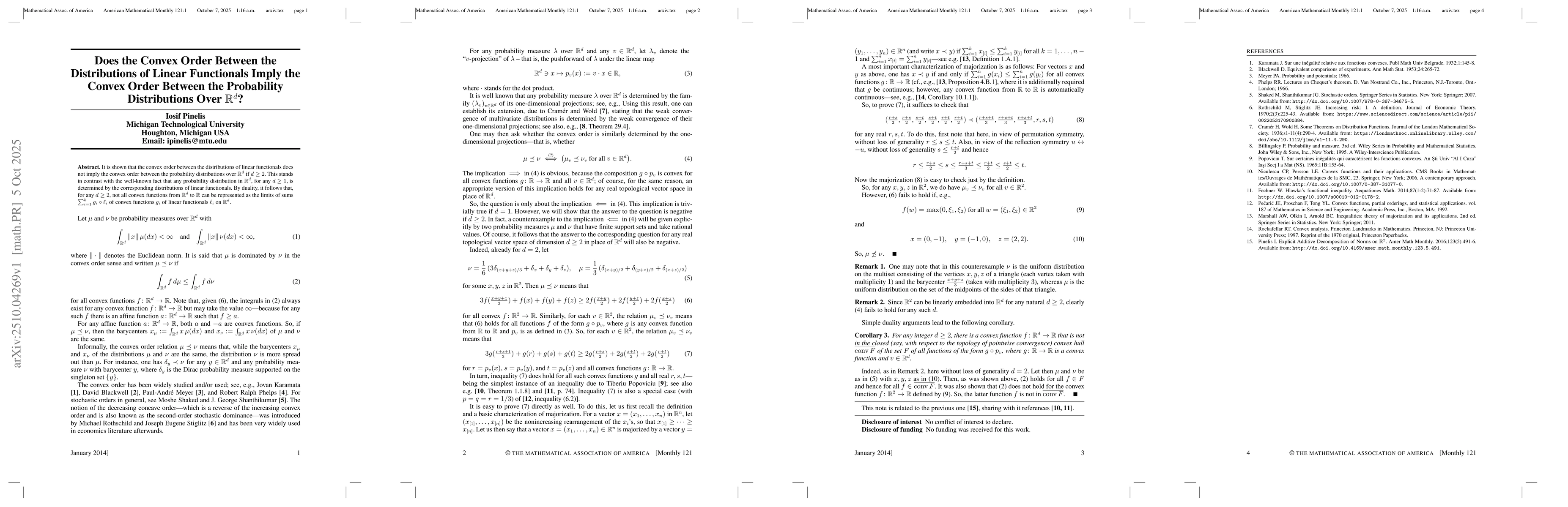 Introduces a novel counterexample demonstrating that convex order of projections does not imply convex order of the original distributions in dimensions $d \geq 2$, resolving an open question about representation of convex functions.
