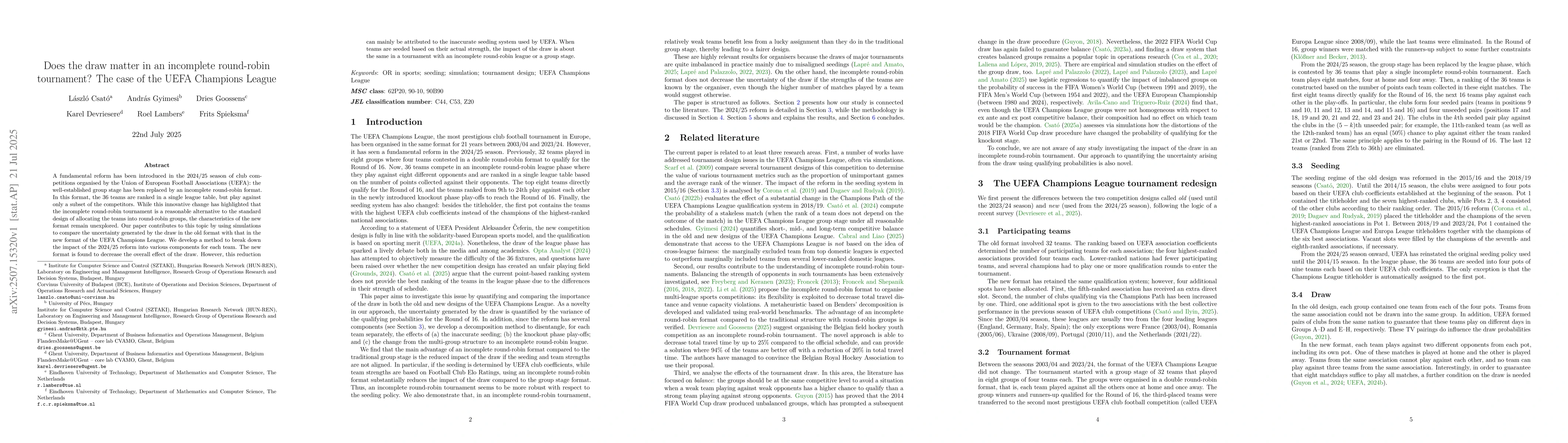 A fundamental reform has been introduced in the 2024/25 season of club competitions organised by the Union of European Football Associations (UEFA): the well-established group stage has been replaced by an incomplete round-robin format. In this format, the 36 teams are ranked in a single league table, but play against only a subset of the competitors. While this innovative change has highlighted that the incomplete round-robin tournament is a reasonable alternative to the standard design of allocating the teams into round-robin groups, the characteristics of the new format remain unexplored. Our paper contributes to this topic by using simulations to compare the uncertainty generated by the draw in the old format with that in the new format of the UEFA Champions League. We develop a method to break down the impact of the 2024/25 reform into various components for each team. The new format is found to decrease the overall effect of the draw. However, this reduction can mainly be attributed to the inaccurate seeding system used by UEFA. When teams are seeded based on their actual strength, the impact of the draw is about the same in a tournament with an incomplete round-robin league or a group stage.