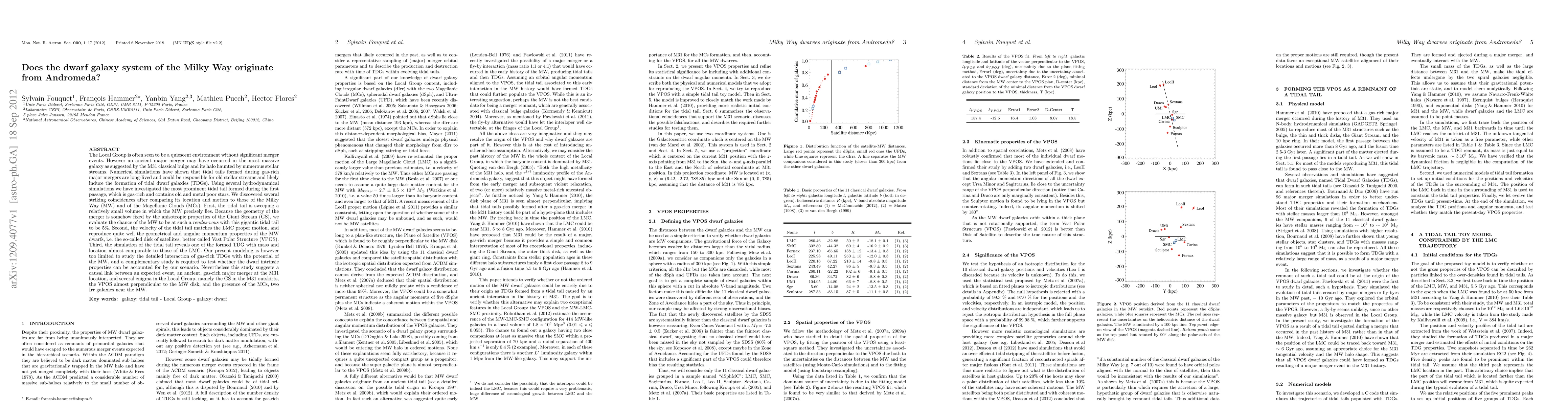 The Local Group is often seen to be a quiescent environment without significant merger events. However an ancient major merger may have occurred in the most massive galaxy. Numerical simulations have shown that tidal tails formed during gas-rich major mergers are long-lived and could be responsible for old stellar streams and likely induce the formation of tidal dwarf galaxies (TDGs). Using several hydrodynamical simulations we have investigated the most prominent tidal tail formed during the first passage, which is gas-rich and contains old and metal poor stars. We discovered several striking coincidences after comparing its location and motion to those of the Milky Way (MW) and of the Magellanic Clouds (MCs). First, the tidal tail is sweeping a relatively small volume in which the MW precisely lies. Because the geometry of the merger is somehow fixed by the anisotropic properties of the Giant Stream (GS), we evaluate the chance of the MW to be at such a rendez-vous with this gigantic tidal tail to be 5 %. Second, the velocity of the tidal tail matches the LMC proper motion, and reproduce quite well the geometrical and angular momentum properties of the MW dwarfs, i.e. the so-called disk of satellites, better called Vast Polar Structure (VPOS). Third, the simulation of the tidal tail reveals one of the formed TDG with mass and location almost comparable to those of the LMC. Our present modeling is however too limited to study the detailed interaction of gas-rich TDGs with the potential of the MW, and a complementary study is required to test whether the dwarf intrinsic properties can be accounted for by our scenario. Nevertheless this study suggests a causal link between an ancient, gas-rich major merger at the M31 location, and several enigma in the Local Group, the GS, the VPOS, and the presence of the MCs.