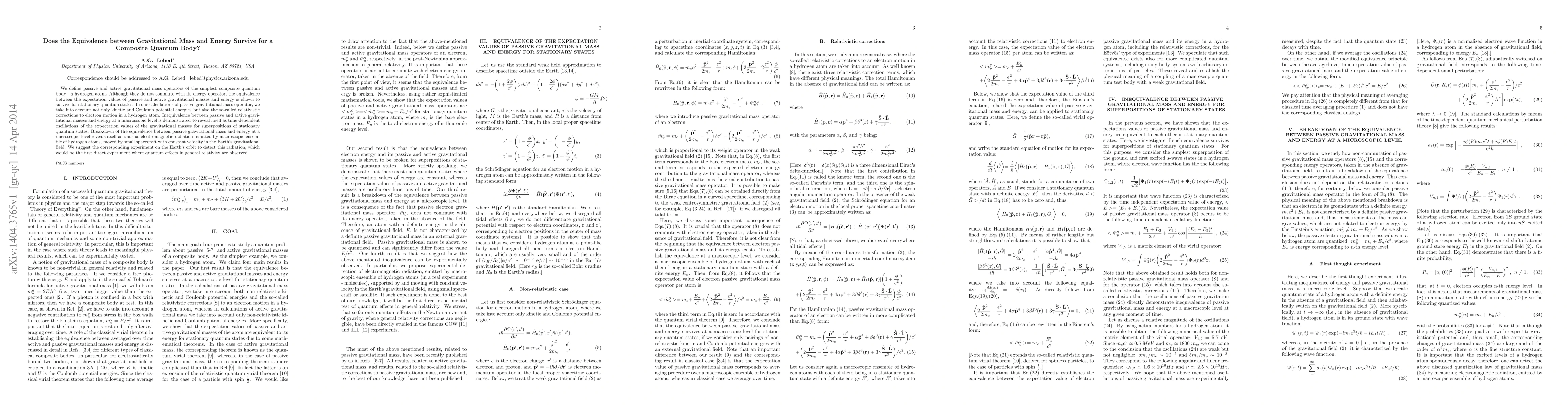 We define passive and active gravitational mass operators of the simplest composite quantum body - a hydrogen atom. Although they do not commute with its energy operator, the equivalence between the expectation values of passive and active gravitational masses and energy is shown to survive for stationary quantum states. In our calculations of passive gravitational mass operator, we take into account not only kinetic and Coulomb potential energies but also the so-called relativistic corrections to electron motion in a hydrogen atom. Inequivalence between passive and active gravitational masses and energy at a macroscopic level is demonstrated to reveal itself as time dependent oscillations of the expectation values of the gravitational masses for superpositions of stationary quantum states. Breakdown of the equivalence between passive gravitational mass and energy at a microscopic level reveals itself as unusual electromagnetic radiation, emitted by macroscopic ensemble of hydrogen atoms, moved by small spacecraft with constant velocity in the Earth's gravitational field. We suggest the corresponding experiment on the Earth's orbit to detect this radiation, which would be the first direct experiment where quantum effects in general relativity are observed.