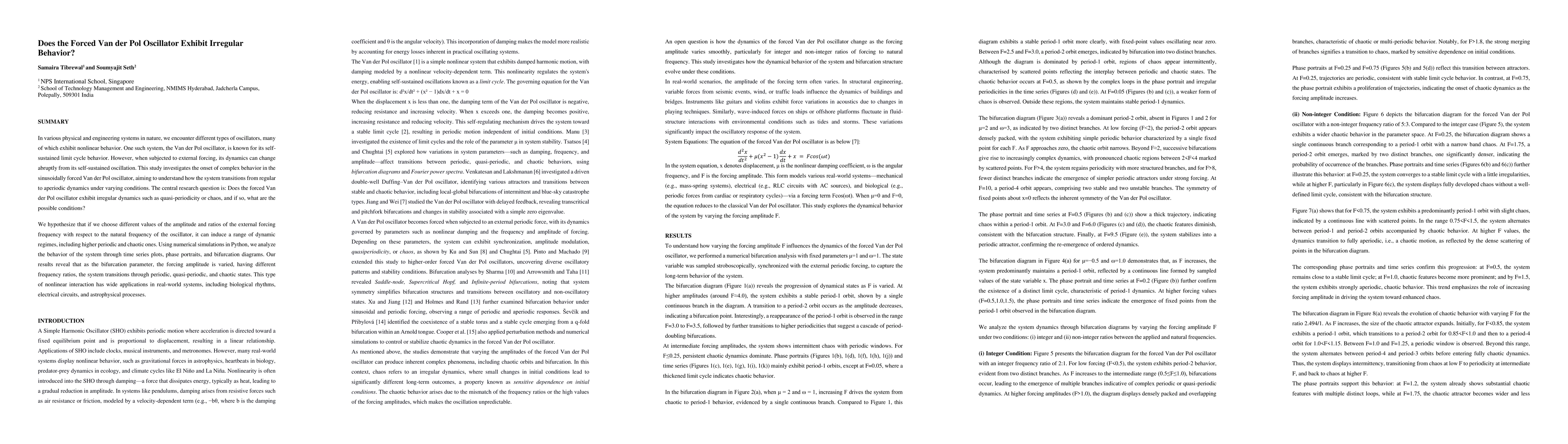The sinusoidally forced Van der Pol oscillator exhibits complex dynamics, transitioning from regular to aperiodic behavior as forcing amplitude and frequency ratio vary, revealing nonlinear interactions with significant implications for applications in physics, biology, and engineering.