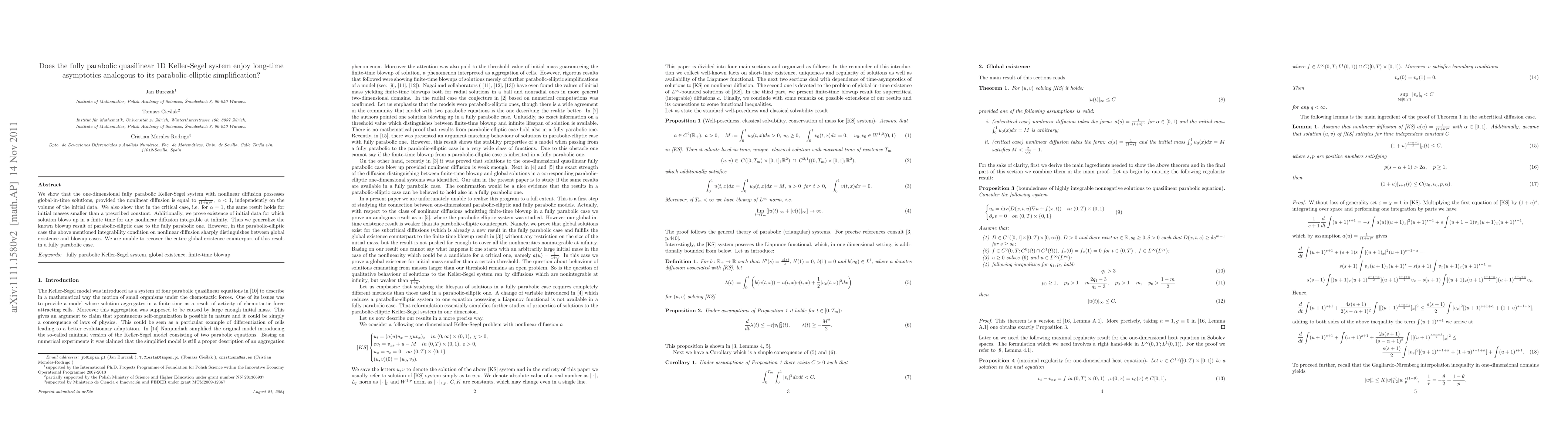 This paper investigates the long-time behavior of the fully parabolic quasilinear 1D Keller-Segel system, proving global-in-time solutions under specific nonlinear diffusion conditions. It also demonstrates blowup scenarios for certain initial data, extending known results from the parabolic-elliptic case but not fully replicating the global existence counterpart.