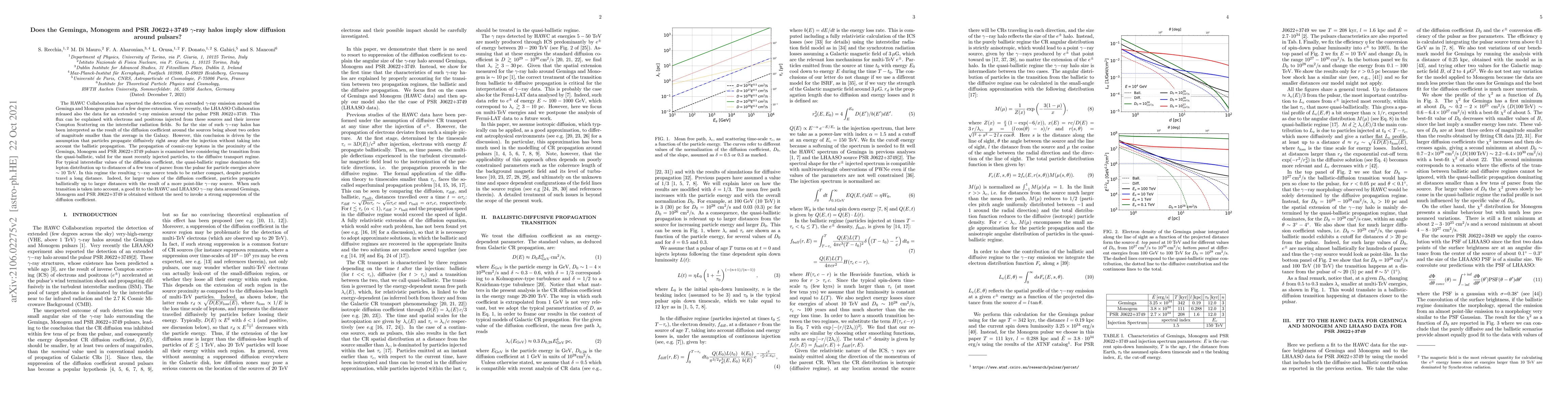 The HAWC Collaboration has reported the detection of an extended $\gamma$-ray emission around the Geminga and Monogem pulsars of a few degree extension. Very recently, the LHAASO Collaboration released also the data for an extended $\gamma$-ray emission around the pulsar PSR J0622+3749. This flux can be explained with electrons and positrons injected from these sources and their inverse Compton Scattering on the interstellar radiation fields. So far the size of such $\gamma-$ray halos has been interpreted as the result of the diffusion coefficient around the sources being about two orders of magnitude smaller than the average in the Galaxy. However, this conclusion is driven by the assumption that particles propagate diffusively right away after the injection without taking into account the ballistic propagation. The propagation of cosmic-ray leptons in the proximity of the Geminga, Monogem and PSR J0622+3749 pulsars is examined here considering the transition from the quasi-ballistic, valid for the most recently injected particles, to the diffusive transport regime. For typical interstellar values of the diffusion coefficient, the quasi-ballistic regime dominates the lepton distribution up to distances of a few tens of parsec from the pulsar for particle energies above $\sim 10$ TeV. In this regime the resulting $\gamma-$ray source tends to be rather compact, despite particles travel a long distance. Indeed, for larger values of the diffusion coefficient, particles propagate ballistically up to larger distances with the result of a more point-like $\gamma-$ray source. When such transition is taken into account, a good fit to the HAWC and LHAASO $\gamma-$ray data around Geminga, Monogem and PSR J0622+3749 is obtained without the need to invoke a strong suppression of the diffusion coefficient.