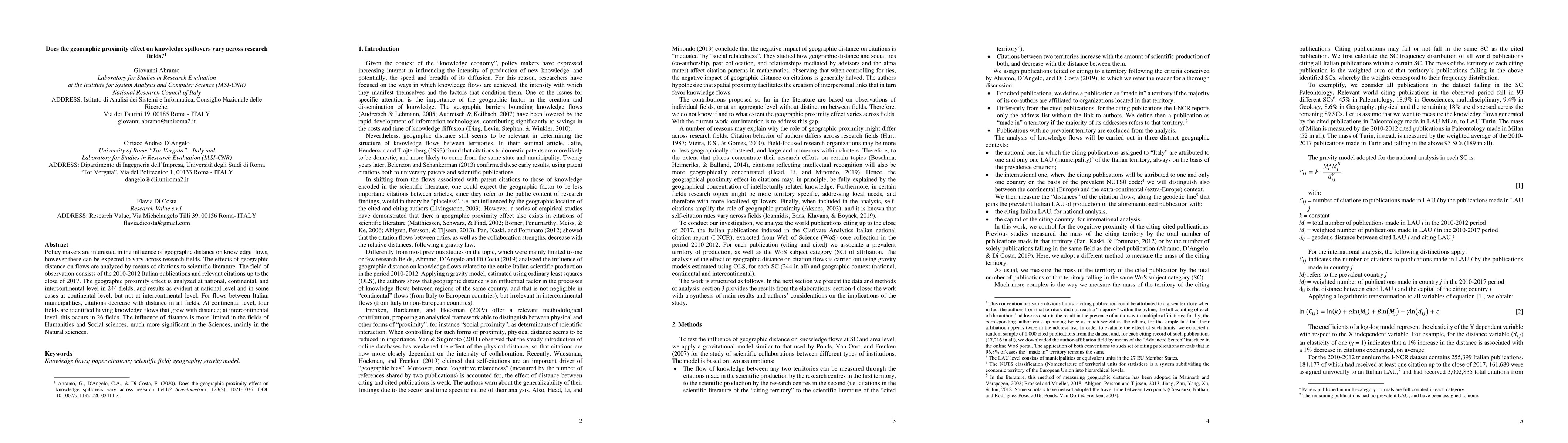 This study examines the geographic proximity effect on knowledge spillovers across various research fields, finding significant effects at national and continental levels but not at intercontinental levels. The analysis of Italian publications and citations reveals that distance impacts knowledge flows more strongly in the Natural sciences than in the Humanities and Social sciences.