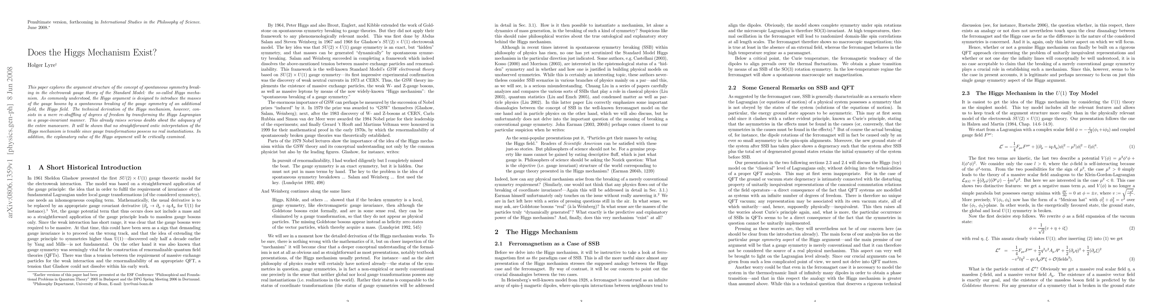 This paper explores the argument structure of the concept of spontaneous symmetry breaking in the electroweak gauge theory of the Standard Model: the so-called Higgs mechanism. As commonly understood, the Higgs argument is designed to introduce the masses of the gauge bosons by a spontaneous breaking of the gauge symmetry of an additional field, the Higgs field. The technical derivation of the Higgs mechanism, however, consists in a mere re-shuffling of degrees of freedom by transforming the Higgs Lagrangian in a gauge-invariant manner. This already raises serious doubts about the adequacy of the entire manoeuvre. It will be shown that no straightforward ontic interpretation of the Higgs mechanism is tenable since gauge transformations possess no real instantiations. In addition, the explanatory value of the Higgs argument will be critically examined.