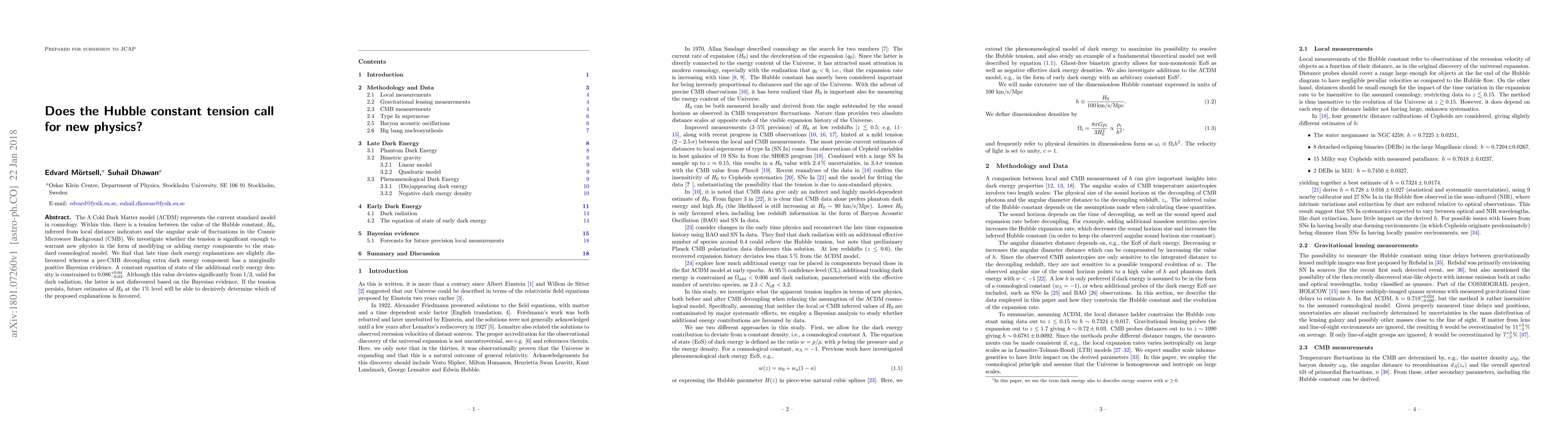 The $\Lambda$ Cold Dark Matter model ($\Lambda$CDM) represents the current standard model in cosmology. Within this, there is a tension between the value of the Hubble constant, $H_0$, inferred from local distance indicators and the angular scale of fluctuations in the Cosmic Microwave Background (CMB). We investigate whether the tension is significant enough to warrant new physics in the form of modifying or adding energy components to the standard cosmological model. We find that late time dark energy explanations are slightly disfavoured whereas a pre-CMB decoupling extra dark energy component has a marginally positive Bayesian evidence. A constant equation of state of the additional early energy density is constrained to 0.086$^{+0.04}_{-0.03}$. Although this value deviates significantly from 1/3, valid for dark radiation, the latter is not disfavoured based on the Bayesian evidence. If the tension persists, future estimates of $H_0$ at the 1$\%$ level will be able to decisively determine which of the proposed explanations is favoured.