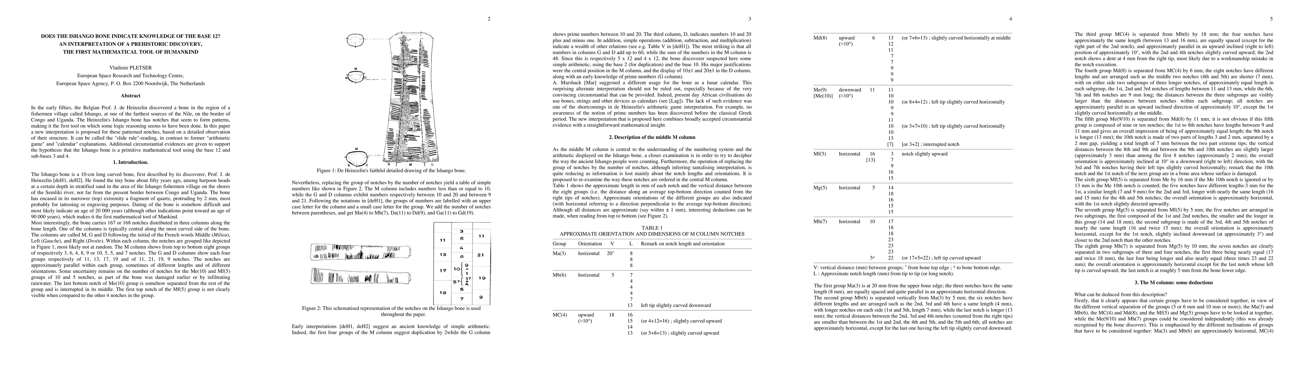 The Ishango Bone is reinterpreted as a primitive mathematical tool using base 12 and its sub-bases, with notches forming patterns that resemble a slide rule, providing new insights into early human mathematical knowledge.