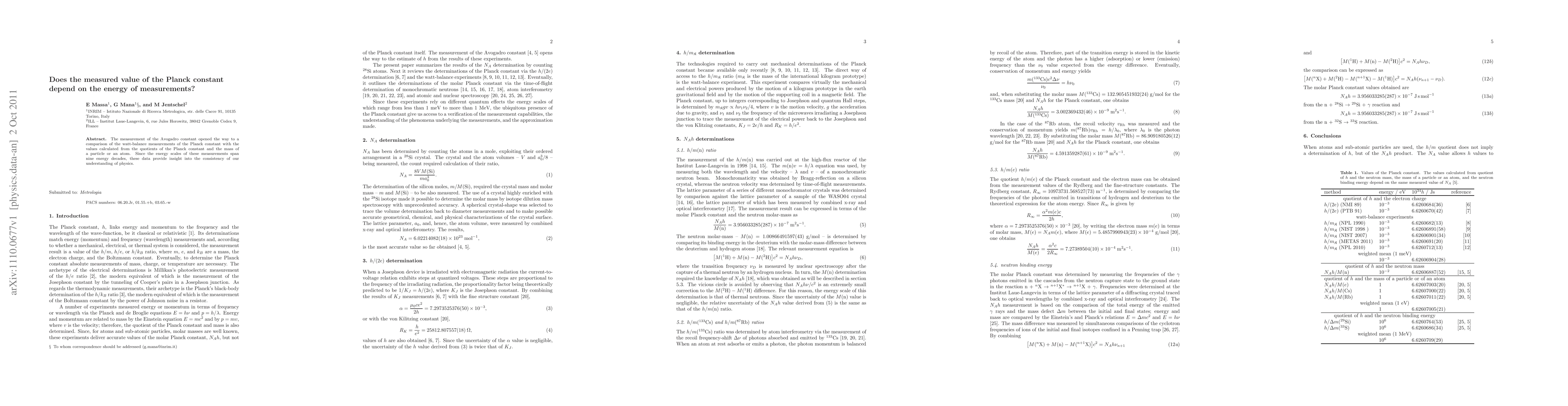 Summary: This study compares the Planck constant values derived from watt-balance measurements with those calculated from particle masses, spanning nine energy decades, to investigate if the Planck constant's measured value varies with energy. The findings aim to assess the consistency of our physical understanding across different energy scales.