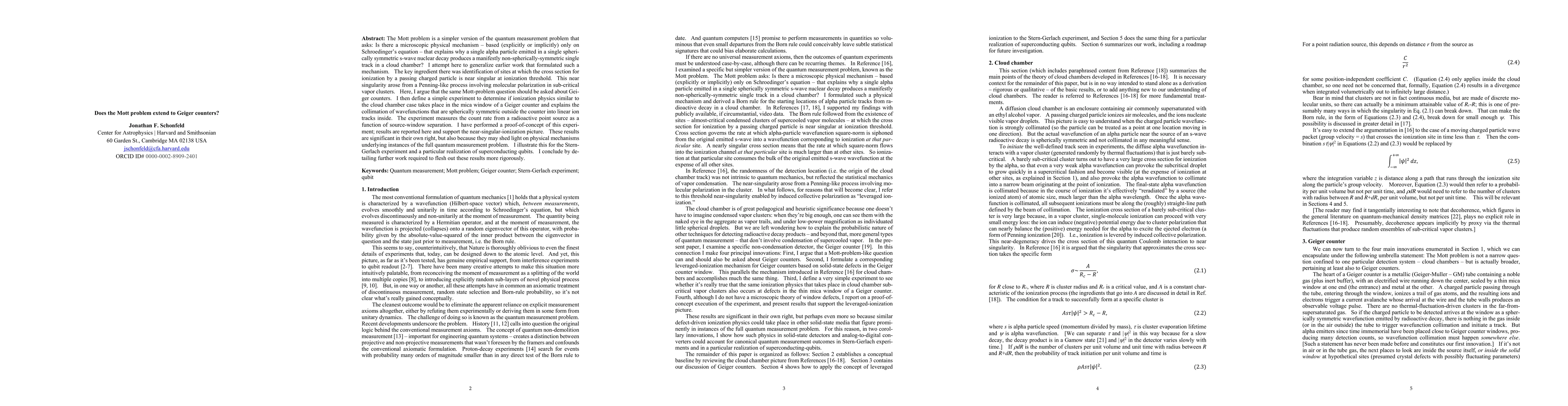The Mott problem is a simpler version of the quantum measurement problem that asks: Is there a microscopic physical mechanism - based (explicitly or implicitly) only on Schroedinger's equation - that explains why a single alpha particle emitted in a spherically symmetric s-wave nuclear decay produces a manifestly non-spherically-symmetric single track in a cloud chamber? I attempt here to generalize earlier work that formulated such a mechanism. The key ingredient there was identification of sites at which the cross section for ionization by a passing charged particle is near singular at ionization threshold. This near singularity arose from a Penning-like process involving molecular polarization in sub-critical vapor clusters. Here, I argue that the same Mott problem question should be asked about Geiger counters. I then define a simple experiment to determine if ionization physics similar to the cloud chamber case takes place in the mica window of a Geiger counter and explains the collimation of wavefunctions that are spherically symmetric outside the counter into linear tracks inside. The experiment measures the count rate from a radioactive point source as a function of source-window separation. I have performed a proof of concept of this experiment; results are reported here and support the near-singular-ionization picture. These results are significant in their own right, but also because they may shed light on physical mechanisms underlying the full quantum measurement problem. I illustrate this for the Stern-Gerlach experiment and a particular realization of superconducting qubits. I conclude by detailing further work required to flesh out these results more rigorously.