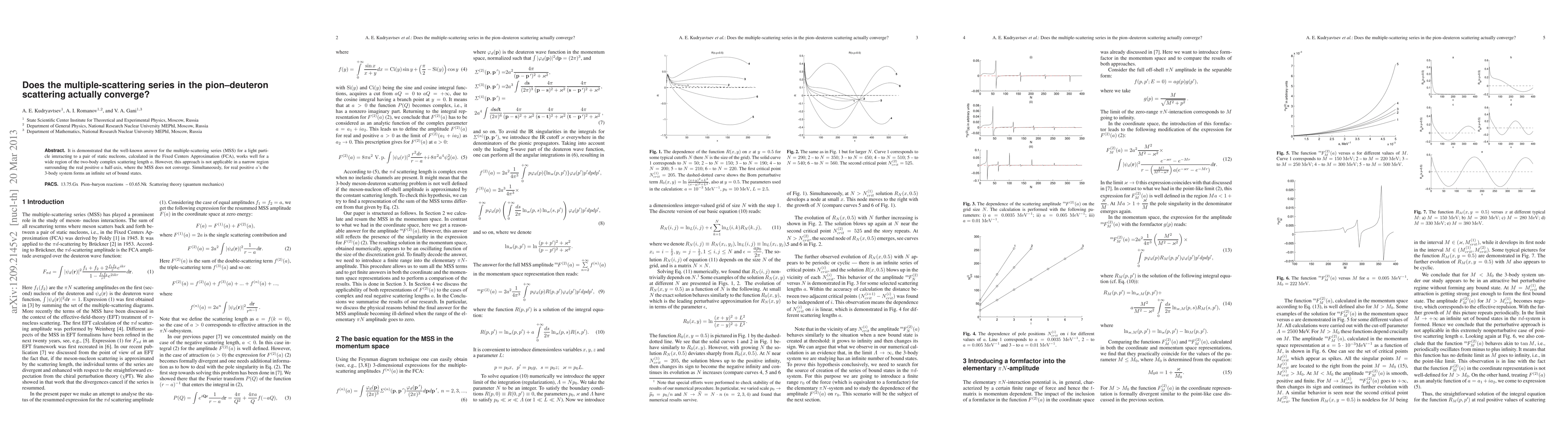 The research finds that the multiple-scattering series for pion-deuteron scattering, calculated under the Fixed Centers Approximation, accurately represents the system except near the real positive scattering length half-axis. Here, the series does not converge, while paradoxically, for real positive scattering lengths, the three-body system creates an infinite number of bound states.