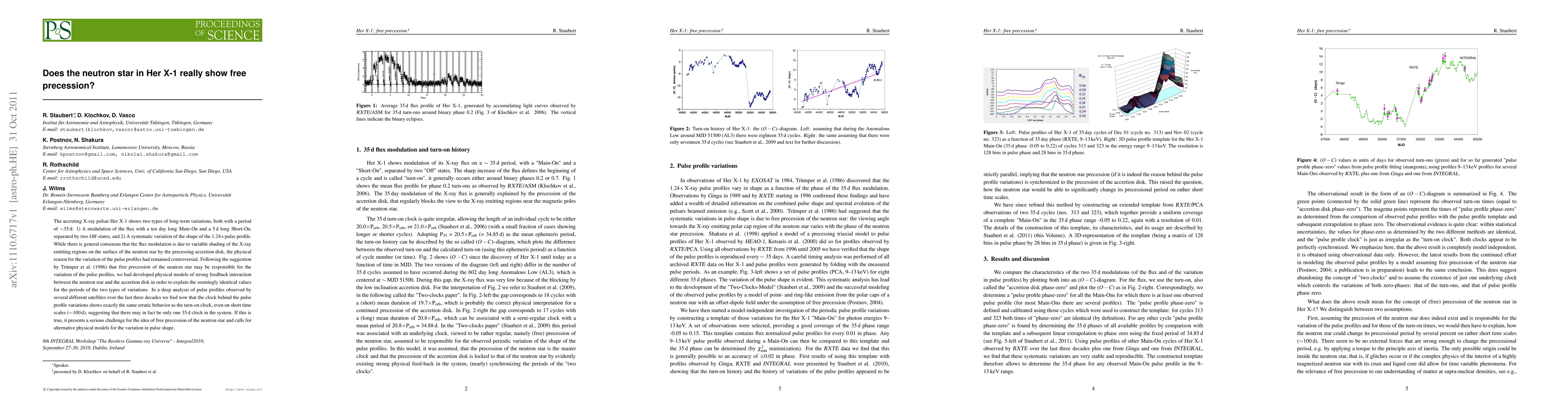 The research challenges the idea of a neutron star's free precession in Her X-1, as pulse profile variations show identical erratic behavior to the flux modulation clock. This suggests only one 35-day clock in the system, necessitating alternative explanations for pulse shape changes.