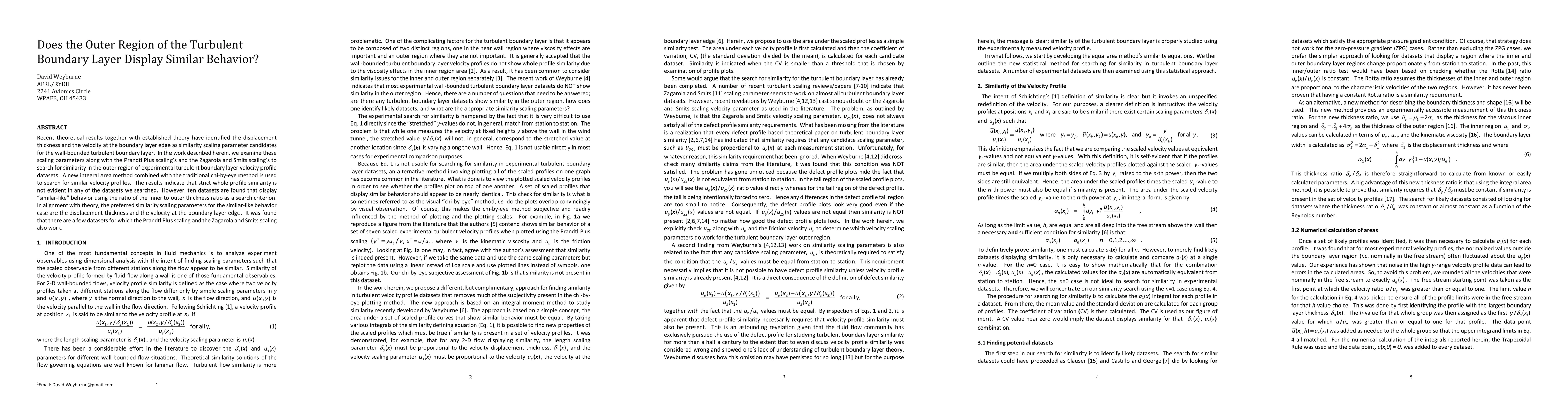 Recent theoretical results together with established theory have identified the displacement thickness and the velocity at the boundary layer edge as similarity scaling parameter candidates for the wall-bounded turbulent boundary layer. In the work described herein, we examine these scaling parameters along with the Prandtl Plus scaling's and the Zagarola and Smits scaling's to search for similarity in the outer region of experimental turbulent boundary layer velocity profile datasets. A new integral area method combined with the traditional chi-by-eye method is used to search for similar velocity profiles. The results indicate that strict whole profile similarity is not evident in any of the datasets we searched. However, ten datasets are found that display "similar-like" behavior using the ratio of the inner to outer thickness ratio as a search criterion. In alignment with theory, the preferred similarity scaling parameters for the similar-like behavior case are the displacement thickness and the velocity at the boundary layer edge. It was found that there are a few datasets for which the Prandtl Plus scaling and the Zagarola and Smits scaling also work.