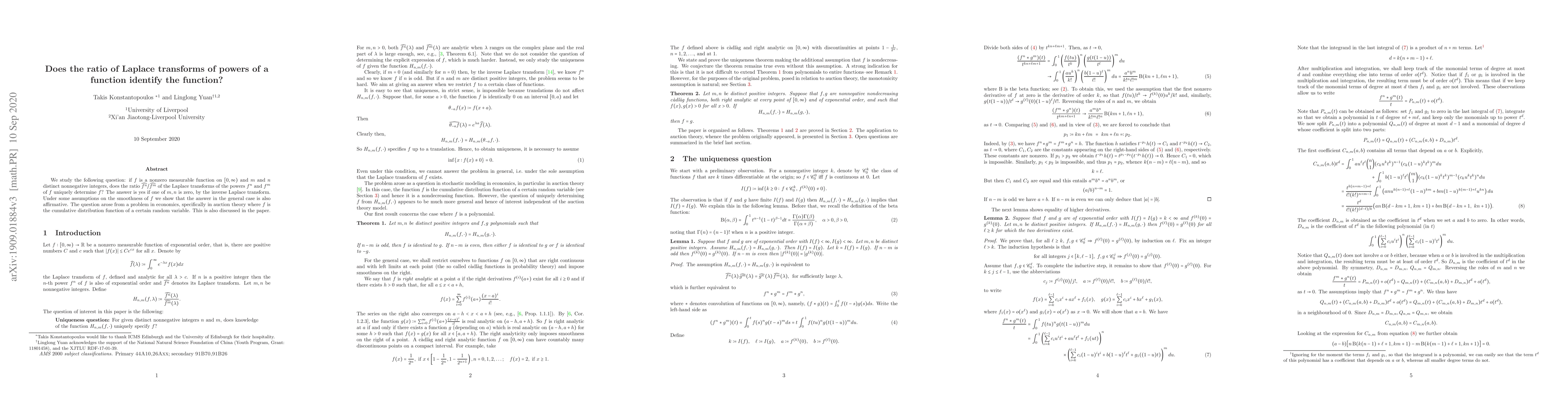 This paper investigates whether the ratio of Laplace transforms of powers of a measurable function $f$ uniquely identifies $f$. It confirms that under certain smoothness assumptions, the ratio $\widehat{f^n}/\widehat{f^m}$ does uniquely determine $f$, addressing a question originating from auction theory in economics.
