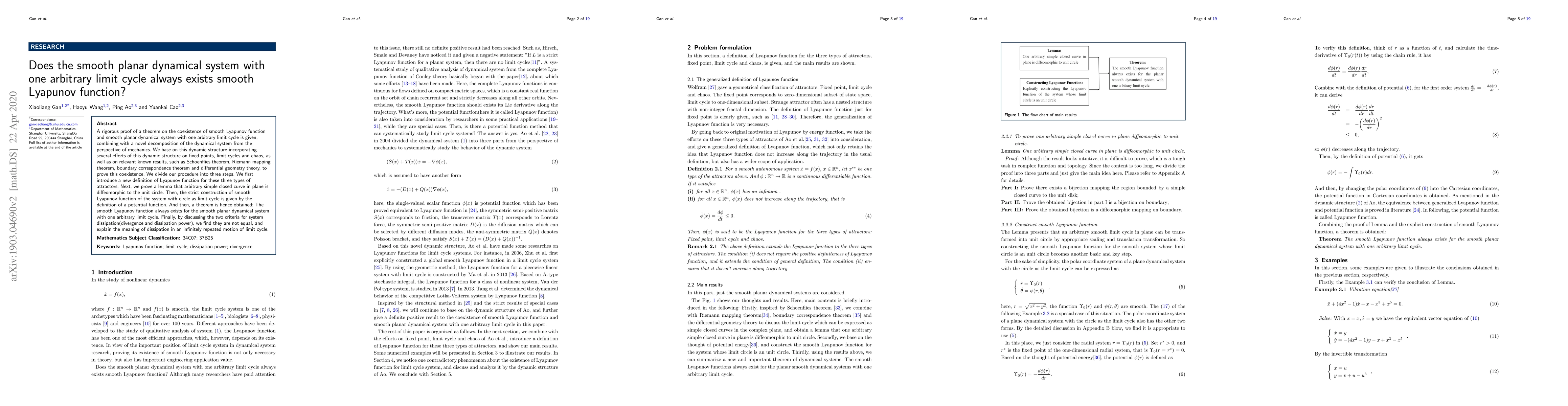 A rigorous proof of a theorem on the coexistence of smooth Lyapunov function and smooth planar dynamical system with one arbitrary limit cycle is given, combining with a novel decomposition of the dynamical system from the perspective of mechanics. We base on this dynamic structure incorporating several efforts of this dynamic structure on fixed points, limit cycles and chaos, as well as on relevant known results, such as Schoenflies theorem, Riemann mapping theorem, boundary correspondence theorem and differential geometry theory, to prove this coexistence. We divide our procedure into three steps. We first introduce a new definition of Lyapunov function for these three types of attractors. Next, we prove a lemma that arbitrary simple closed curve in plane is diffeomorphic to the unit circle. Then, the strict construction of smooth Lyapunov function of the system with circle as limit cycle is given by the definition of a potential function. And then, a theorem is hence obtained: The smooth Lyapunov function always exists for the smooth planar dynamical system with one arbitrary limit cycle. Finally, by discussing the two criteria for system dissipation(divergence and dissipation power), we find they are not equal, and explain the meaning of dissipation in an infinitely repeated motion of limit cycle.