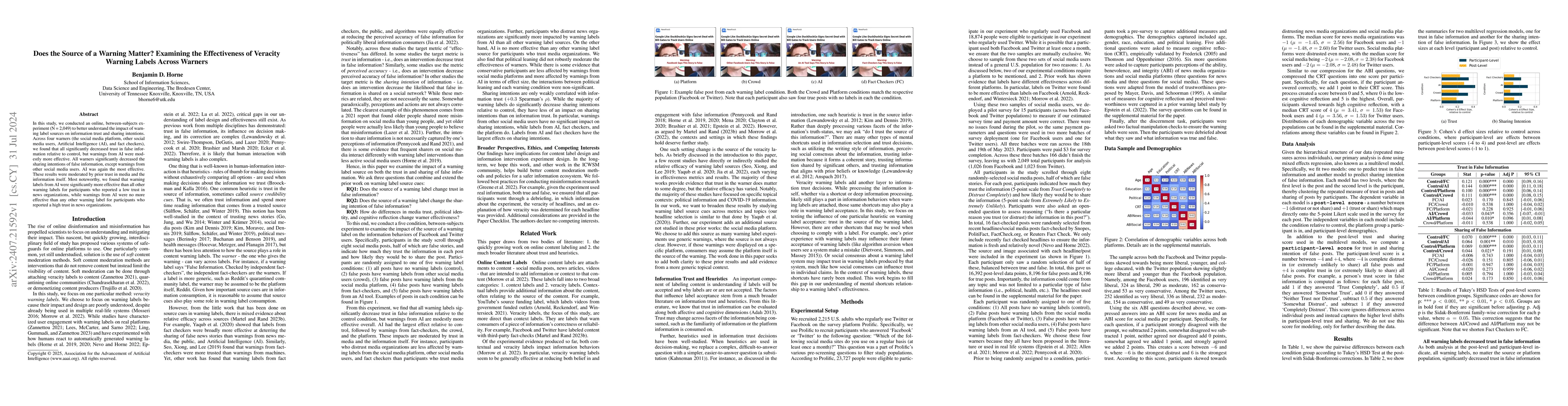 This study investigates how different warning label sources—social media platforms, users, AI, and fact checkers—affect trust and sharing intentions regarding false information. Results show that all warners increase trust and decrease sharing intentions, with AI being most effective, especially among those with low trust in news organizations.