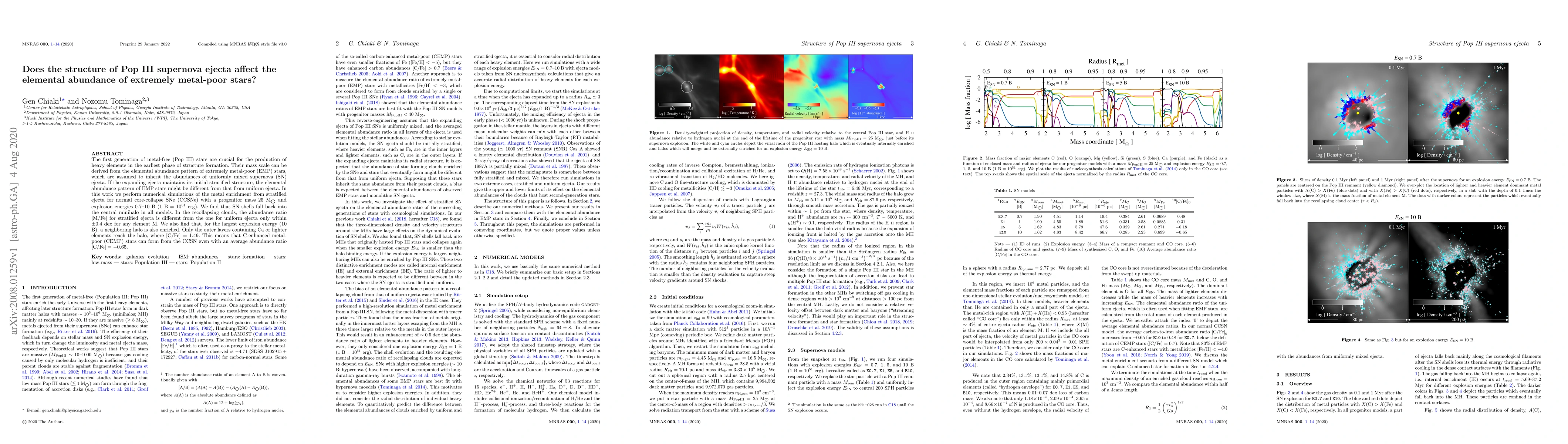 This research investigates whether the stratified structure of Pop III supernova ejecta affects the elemental abundance of extremely metal-poor stars. Numerical simulations reveal that while the stratified ejecta alters the abundance ratio [M/Fe] by up to 0.4 dex, it does not significantly change the overall elemental pattern, suggesting that the first-generation stars' ejecta can still produce CEMP stars even with an average [C/Fe] ratio of -0.65.