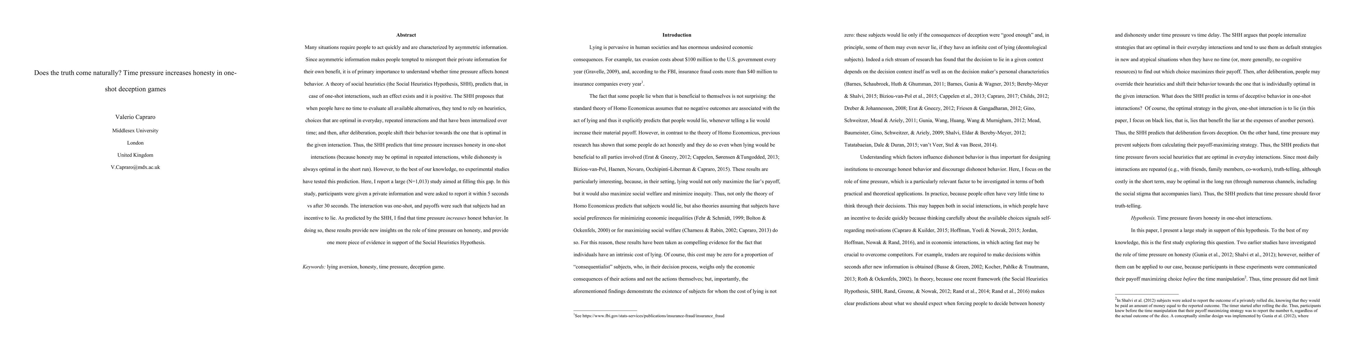 A study of 1,013 participants found that time pressure increases honesty in one-shot deception games, supporting the Social Heuristics Hypothesis. Time constraints led to more honest behavior, suggesting people rely on heuristics when under pressure.