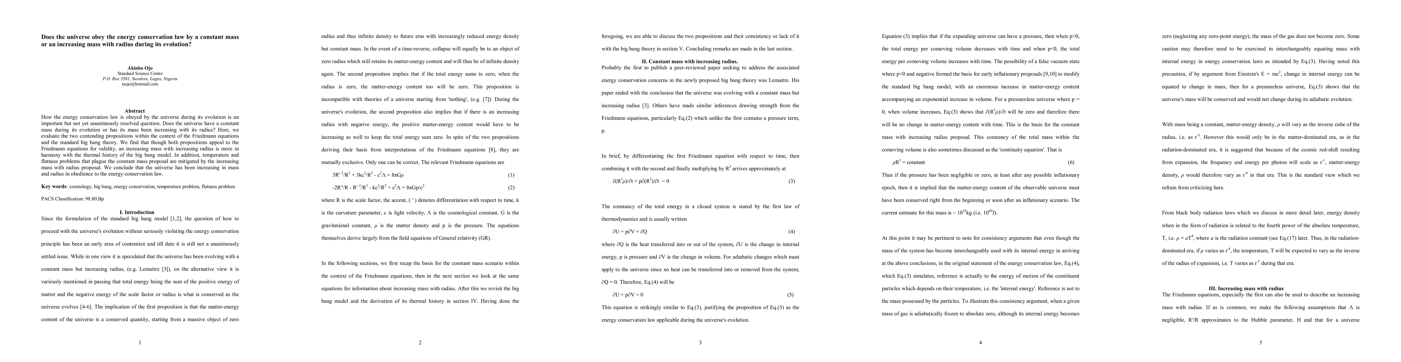 This paper evaluates the energy conservation law in the universe's evolution, finding that an increasing mass with radius aligns better with the thermal history of the big bang model and resolves issues like temperature and flatness problems, thus supporting an expanding mass.