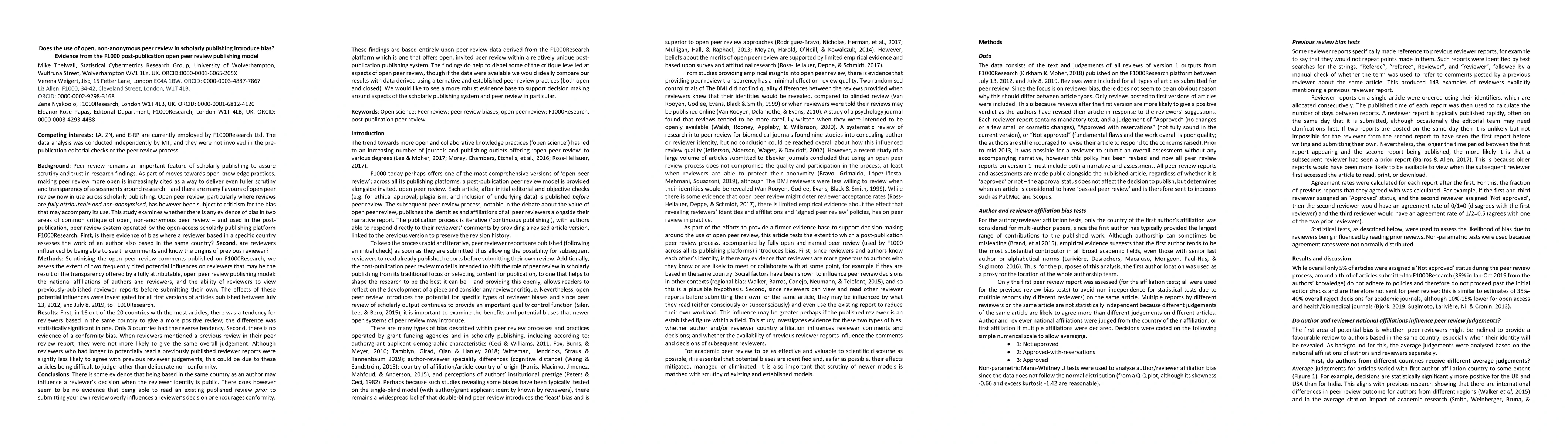 This study investigates potential biases in open, non-anonymous peer review on F1000Research, finding that reviewers from the same country tend to give more positive reviews, though statistically significant differences are rare. There is no evidence of conformity bias when reviewers reference previous reviews, suggesting transparency does not unduly influence their judgments.