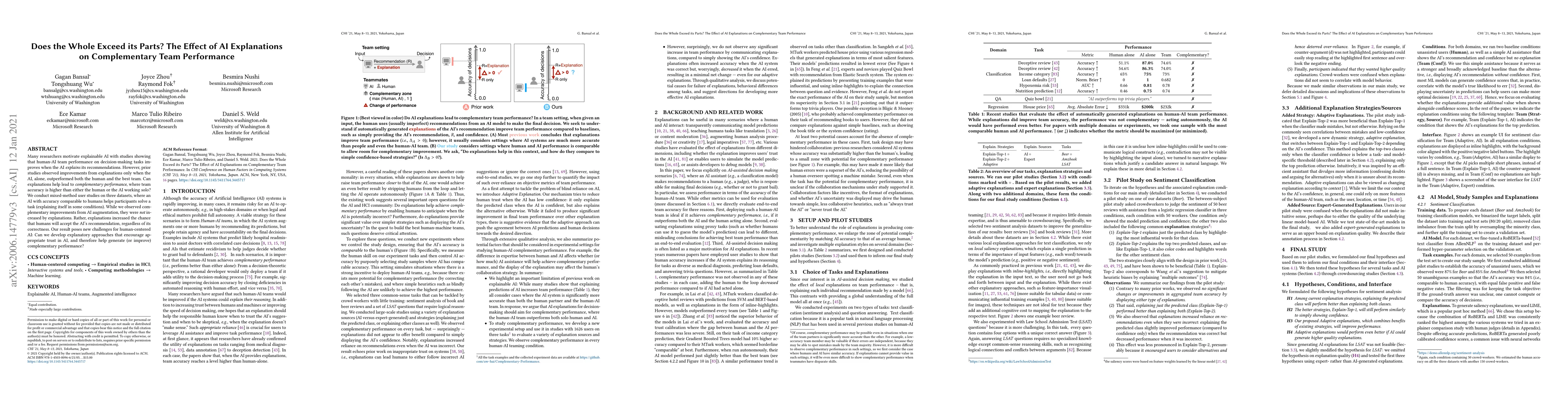 Many researchers motivate explainable AI with studies showing that human-AI team performance on decision-making tasks improves when the AI explains its recommendations. However, prior studies observed improvements from explanations only when the AI, alone, outperformed both the human and the best team. Can explanations help lead to complementary performance, where team accuracy is higher than either the human or the AI working solo? We conduct mixed-method user studies on three datasets, where an AI with accuracy comparable to humans helps participants solve a task (explaining itself in some conditions). While we observed complementary improvements from AI augmentation, they were not increased by explanations. Rather, explanations increased the chance that humans will accept the AI's recommendation, regardless of its correctness. Our result poses new challenges for human-centered AI: Can we develop explanatory approaches that encourage appropriate trust in AI, and therefore help generate (or improve) complementary performance?