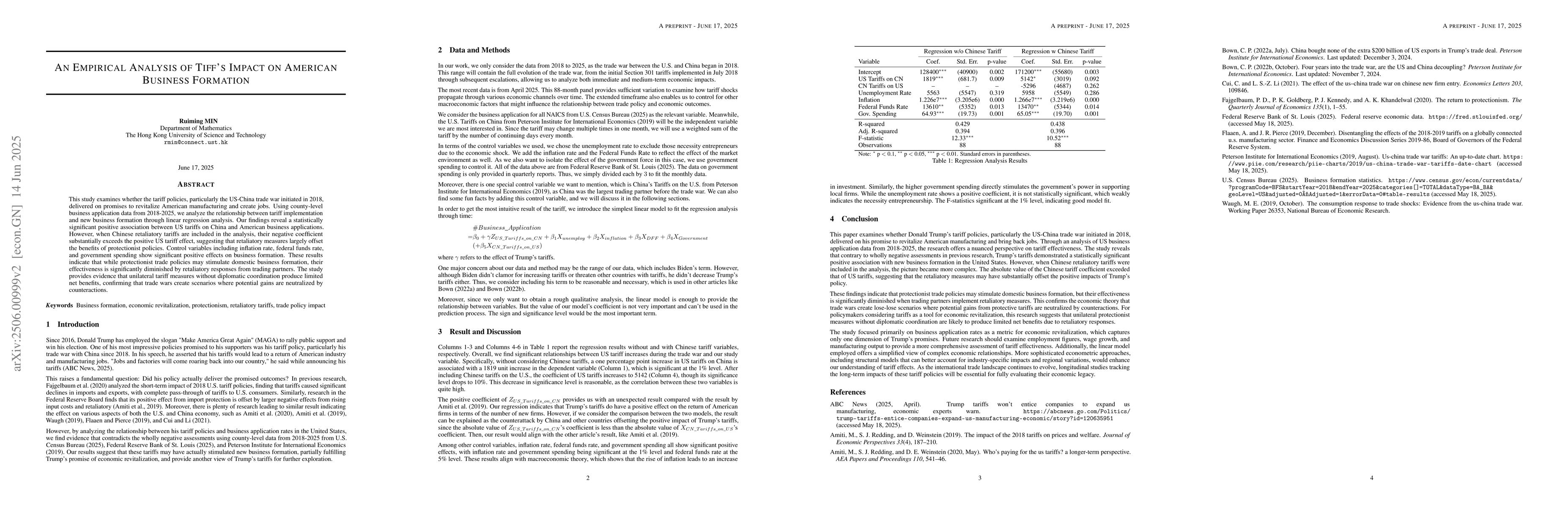 The paper presents an empirical analysis using county-level data and linear regression to assess the effects of tariffs on business formation, contributing to the understanding of trade policy impacts.