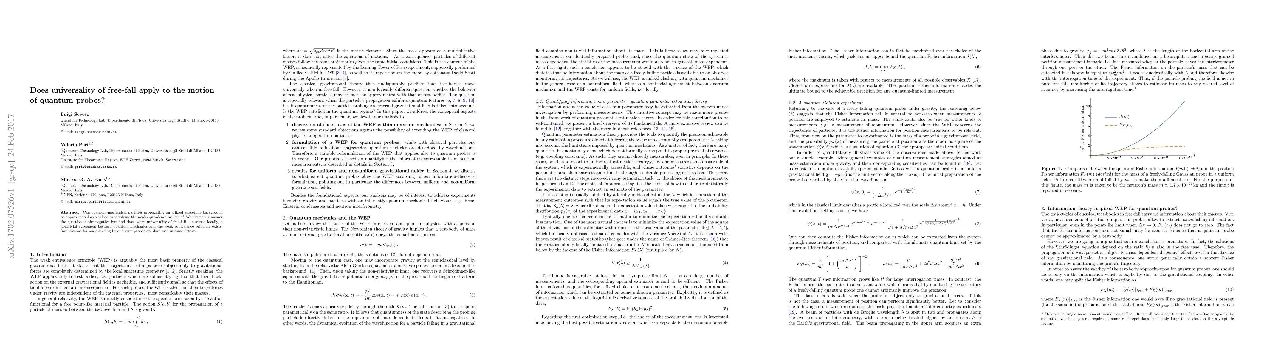 This paper concludes that quantum particles do not universally satisfy the weak equivalence principle in free-fall, but locally, there is a nontrivial alignment between quantum mechanics and this principle. The study also explores the implications for mass sensing using quantum probes.
